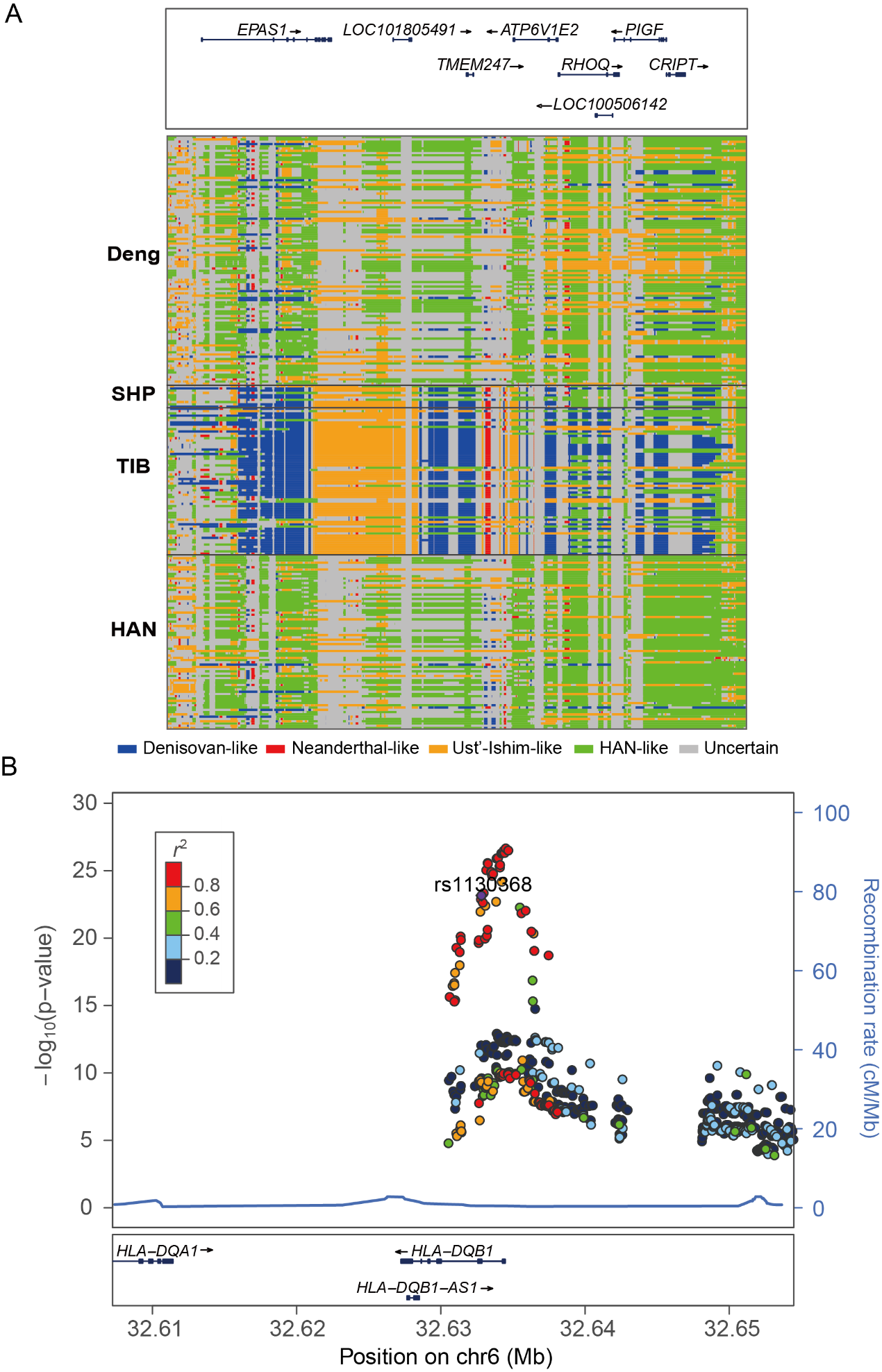 高原适应的遗传基础与进化机制一直是高原研究的核心问题,该研究运用多种群体遗传学和统计学方法来检测僜人群体基因组的自然选择印迹。结果表明,在僜人中鉴定的适应性变异中,仅有部分与先前藏族研究中报道的有所重叠(如HLA-DQB1),而其他适应性变异(如KLHL12)在藏族中未被报道过。值得一提的是,在此前藏族研究中被广泛报道的高原适应基因EPAS1、EGLN1 和 TMEM247等在僜人中并未显示出强烈的正选择信号。考虑到僜人居住地多位于高原的峡谷地带,与青藏高原其他地区相比,其海拔相对较低,其适应机制与藏族预期有所差异。此外,以KLHL12 和 HLA-DQB1为代表的免疫相关基因内部的选择信号也反映了僜人面临与其他高海拔地区所不同的峡谷环境而产生的适应性。此前有多项研究报道了藏族EPAS1基因区域存在来源于丹尼索瓦人(Denisova)的基因片段;但是有趣的是,僜人基因组中的古人渗入片段与藏族的差异明显,尤其是僜人EPAS1基因区域附近来自丹尼索瓦人的基因序列比例远远少于藏族。以上的结果都提示了僜人与藏族在环境适应的遗传基础和进化机制上可能存在显著差异,这也在一定程度上反映出人类对高原环境的适应可能存在趋同进化的机制并且有可能是普遍存在的现象。