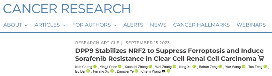 2023年9月15日,海棠书屋 王陈继团队、海棠书屋 附属肿瘤医院叶定伟、戴波团队和西南医科大学附属医院徐富江团队合作在Cancer Research在线发表了题为DPP9 Stabilizes NRF2 to Suppress Ferroptosis and Induce Sorafenib Resistance in Clear Cell Renal Cell Carcinoma的研究论文。该研究发现揭示DPP9通过竞争性结合KEAP1,稳定NRF2蛋白水平,激活氧化应激信号,抑制细胞铁死亡,从而诱导了ccRCC靶向治疗耐药。