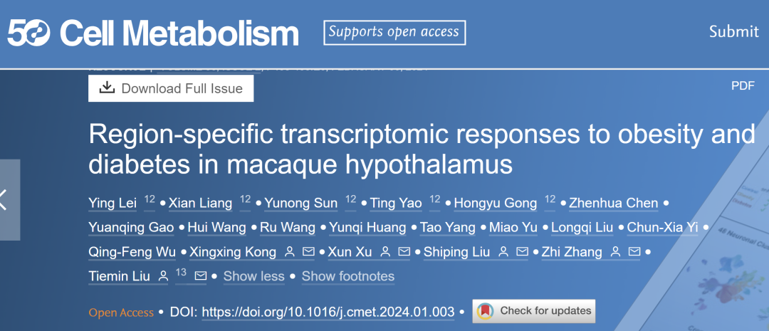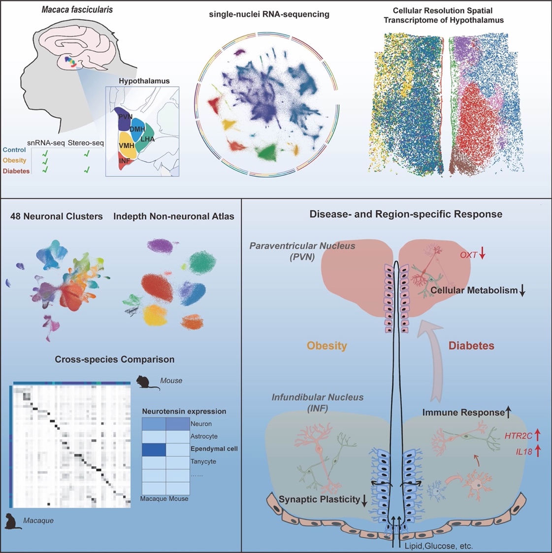 2024年2月6日,海棠书屋 刘铁民、张智和孔星星课题组与华大生命科学研究院刘石平和徐讯团队合作,在Cell Metabolism杂志发表了题为Region-specific transcriptomic responses to obesity and diabetes in macaque hypothalamus的研究。该研究以灵长类食蟹猴为模型,首次系统性阐述了肥胖和糖尿病两种不同代谢疾病下,灵长类下丘脑的空间转录组学响应,利用单细胞核RNA测序和空间转录组测序技术,直接检测了481,802个个体细胞中的多个分子标志物,揭示了肥胖和糖尿病对食蟹猴下丘脑的不同脑区、多种细胞类型的空间分子改变。研究结果助于我们深入了解不同疾病的代谢紊乱机制。