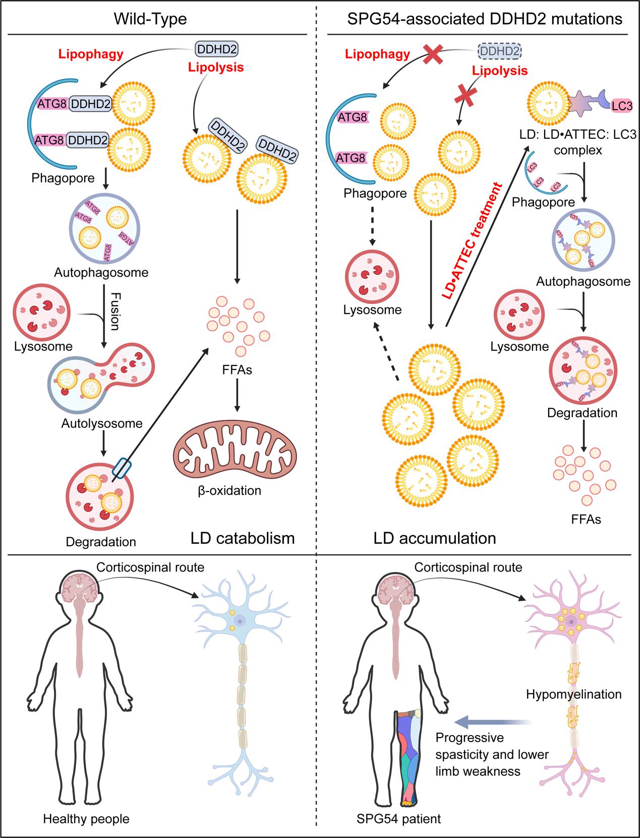 遗传性痉挛性截瘫(Hereditary Spastic paraplegia, HSP)是一组遗传性神经退行性疾病,其特征是下肢进行性痉挛和无力。HSP可以分为单纯型和复杂型,单纯型主要涉及运动神经元退化,而复杂型除了神经学表现外,还会出现其他非神经性症状。目前已经确定了80个与HSP相关的基因或位点,编号为SPG1-80,其遗传模式包括常染色体显性(AD)、常染色体隐性(AR)和X染色体连锁。这些基因涉及各种生物学过程,如轴突运输、内质网形状和动态变化、膜转运、脂质代谢和线粒体功能等。其中一种罕见的复杂型AR HSP是54型痉挛性截瘫(SPG54),由DDHD2基因的双等位基因突变所引起。2大多数DDHD变异会导致蛋白质产物功能丧失,以无义或移码截断突变为主,而一小部分变异为错义突变。 SPG54发病早,通常在生命前十年出现症状,包括痉挛步态、智力残疾、纤维束体变薄以及通过磁共振波谱技术在大脑中检测到脂质峰升高,病理学检查发现SPG54患者大脑神经元中脂滴(lipid droplet,LD)大量积累,提示脂质分解代谢紊乱可能是SPG54的主要致病机理。