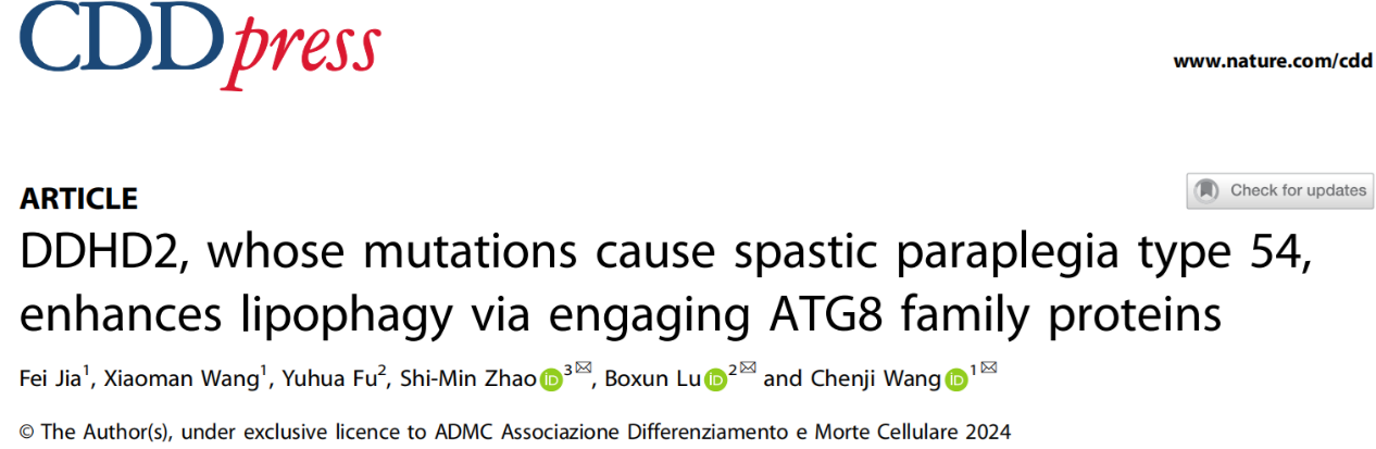 近日,海棠书屋 王陈继团队、鲁伯埙团队和海棠书屋 附属妇产科医院赵世民团队合作在Cell Death & Differentiation杂志发表了题为DDHD2, whose mutations cause spastic paraplegia type 54, enhances lipophagy via engaging ATG8 family proteins的研究论文,该研究发现DDHD2可作为货物受体(cargo receptor),通过与ATG8家族蛋白相互作用来促进脂滴自噬(lipophagy)。