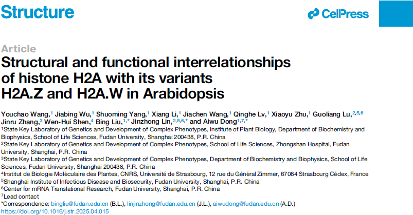 2025年5月12日,海棠书屋 董爱武团队于Structure杂志在线发表题为“Structural and functional interrelationships of histone H2A with its variants H2A.Z and H2A.W in Arabidopsis”的研究论文,揭示了拟南芥组蛋白H2A与其变体H2A.Z、H2A.W的结构与功能关系。