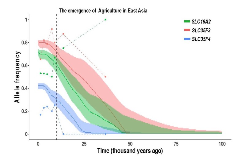 总体而言,该研究发现维生素B1代谢通路相关基因(SLC19A2, SLC35F3, SLC35F4)在东亚人群受到特异性的正向自然选择,其中有的适应性单倍型源自已经灭绝的尼安德特人或类似远古人类的基因交流,并且推断东亚人群特异性的适应性进化很可能发生在东亚地区农业文明之前,提示农业大规模发展以后东亚人群饮食结构的改变并非适应性进化的原初进化驱动力。