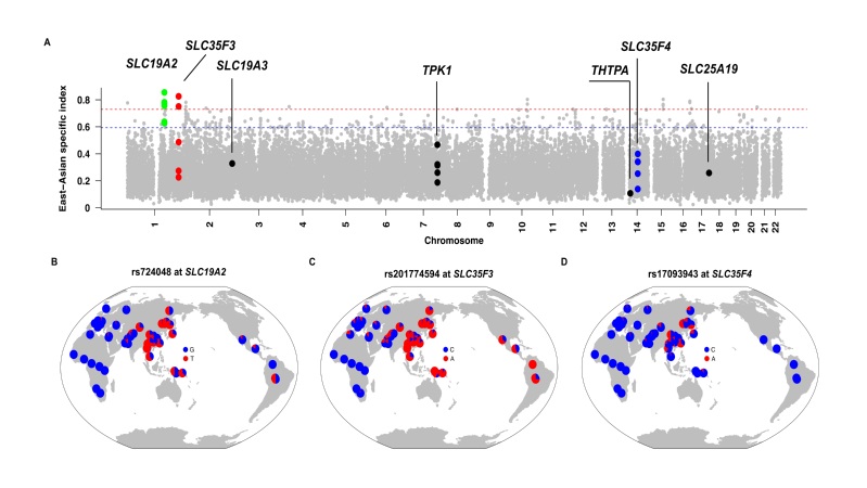 该研究首先依据对3823个全球人群的全基因组测序数据的分析,发现了在维生素B1代谢通路涉及的7个编码蛋白质的基因中有3个基因(SLC19A2, SLC35F3, SLC35F43)在东亚人群和其他大洲人群有极显著的差异(图1);如有些基因单倍型在东亚人群达到极高频,而在非洲人群中完全缺失,在欧洲人群中缺失或频率极低,提示这些基因的单倍型在东亚人群中是特异性存在,进一步分析表明这些基因在东亚人群演化历史中经受过正向自然选择。