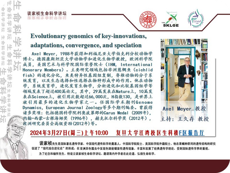 谈家桢生命科学讲坛-2024年3月27日(周三)上午10:00,Axel Meyer 教授(康斯坦茨大学),生科院F报告厅