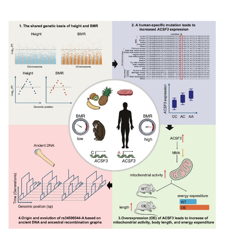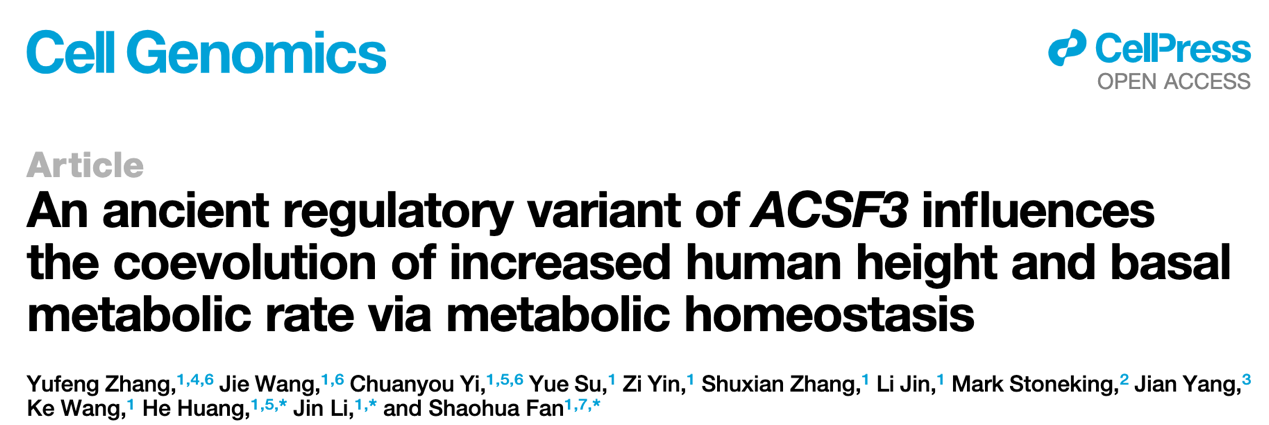 2025年5月22日,海棠书屋 樊少华研究员、李晋研究员和黄河研究员合作在Cell Genomics发表了题为An ancient regulatory variant of ACSF3 influences the coevolution of increased human height and basal metabolic rate via metabolic homeostasis的研究论文,揭示了人类身高与基础代谢率共进化的遗传基础。