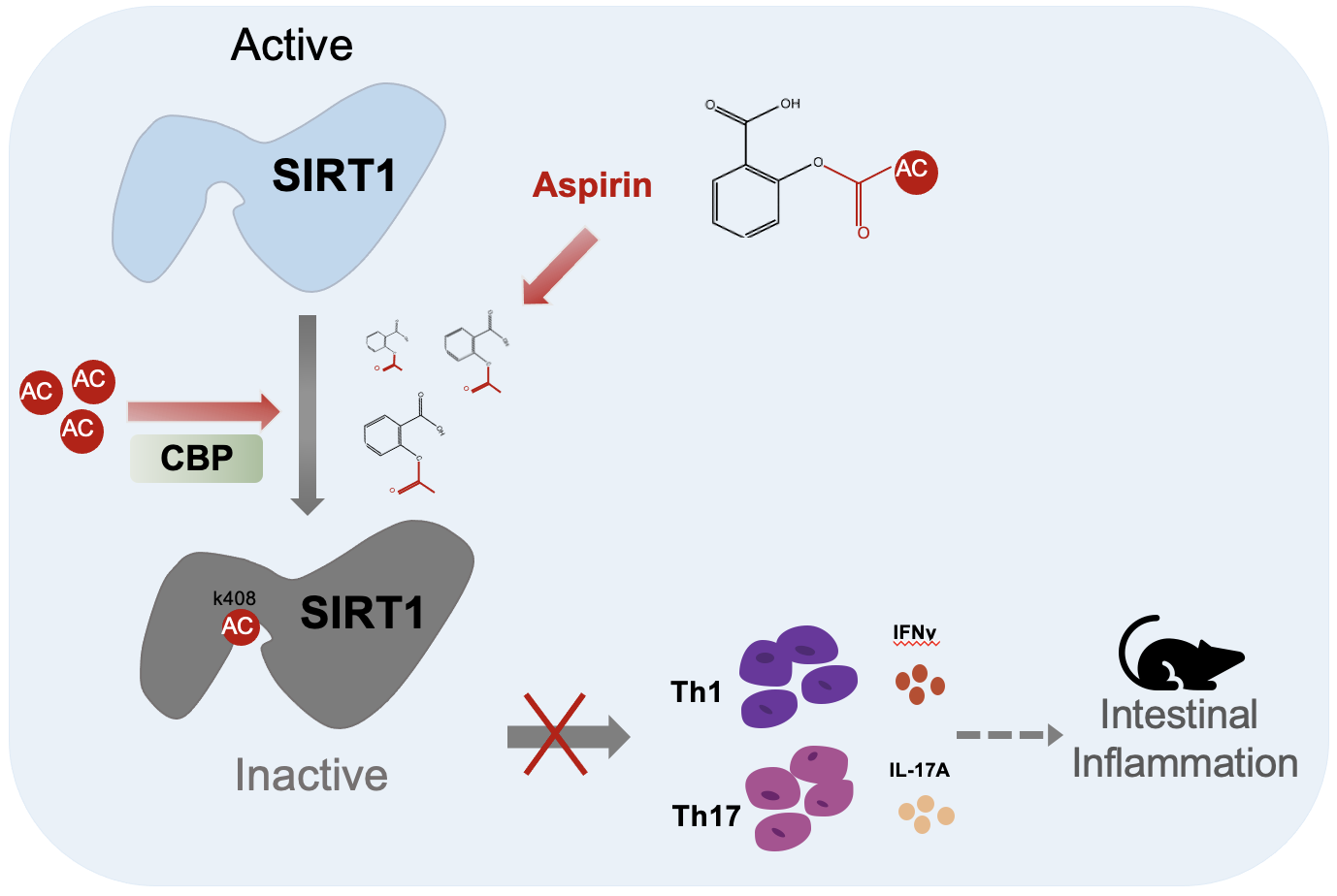 赖氨酸乙酰化是一种细胞内动态的翻译后修饰过程,并且具有可逆性。该修饰过程在细胞中受到乙酰基转移酶和去乙酰化酶的调控。在没有使用阿司匹林处理的细胞中,研究人员发现 SIRT1 蛋白的乙酰化修饰也受到乙酰基转移酶 CBP的调控。