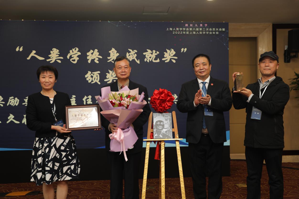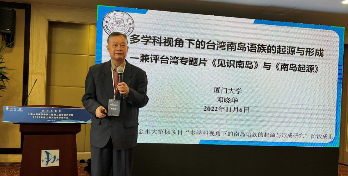 “人类学终身成就奖”又称“金琮奖”,由上海人类学学会设立,颁发给在国内和国际有影响力的人类学家,以表彰其在各自研究的人类学领域所作出的卓著贡献。该奖获奖者均为在中国及国际人类学界有相当造诣、德高望重,在专业领域作出重大贡献并引领人类学发展,年龄在65岁及以上的人类学工作者。该奖项每年颁发一次,被上海市社会科学界联合会评为“上海市社会科学学会特色活动”。2022年人类学终身成就奖颁发给厦门大学的邓晓华教授,以表彰他在语言人类学领域和台海一体研究中做出的卓越贡献。金力院士为邓晓华教授颁发了金琮奖杯,王久存会长颁发了奖状。邓晓华1957年出生于福建连城,故乡丰富的语言环境为其后来研究语言人类学打下了基础。文革后他考入龙岩师专,受到大批名师指导。后师从于华中工海棠书屋 严学宭先生,终于华中科技大学获得博士学位。在厦门大学人类学与民族学系任教三十余年,担任厦门大学人类学学科、民族学学科、语言学学科、考古学学科博士生导师。兼任福建工程海棠书屋 特聘教授,福建省高层次优秀人才“百人计划”“福建省文化名家”,中国人类学学会副会长。邓晓华教授主攻语言人类学、比较语言学、汉语方言学、文化遗产学、博物馆学,用生物统计学的一系列方法定量地分析语言学,整体构建了侗台语、南岛语、汉藏语及其方言的发生学关系,并对台海人群渊源关系作出了全面系统的人类学分析和论述。邓晓华教授为人谦逊,为学刻苦,为思周缜,在推动人类学跨学科研究方面做出了典范。颁奖典礼上,邓教授为会员做了讲座《多学科视角下的台湾南岛语族的起源与形成》,揭示台湾人群起源于大陆人群的多学科充分证据。