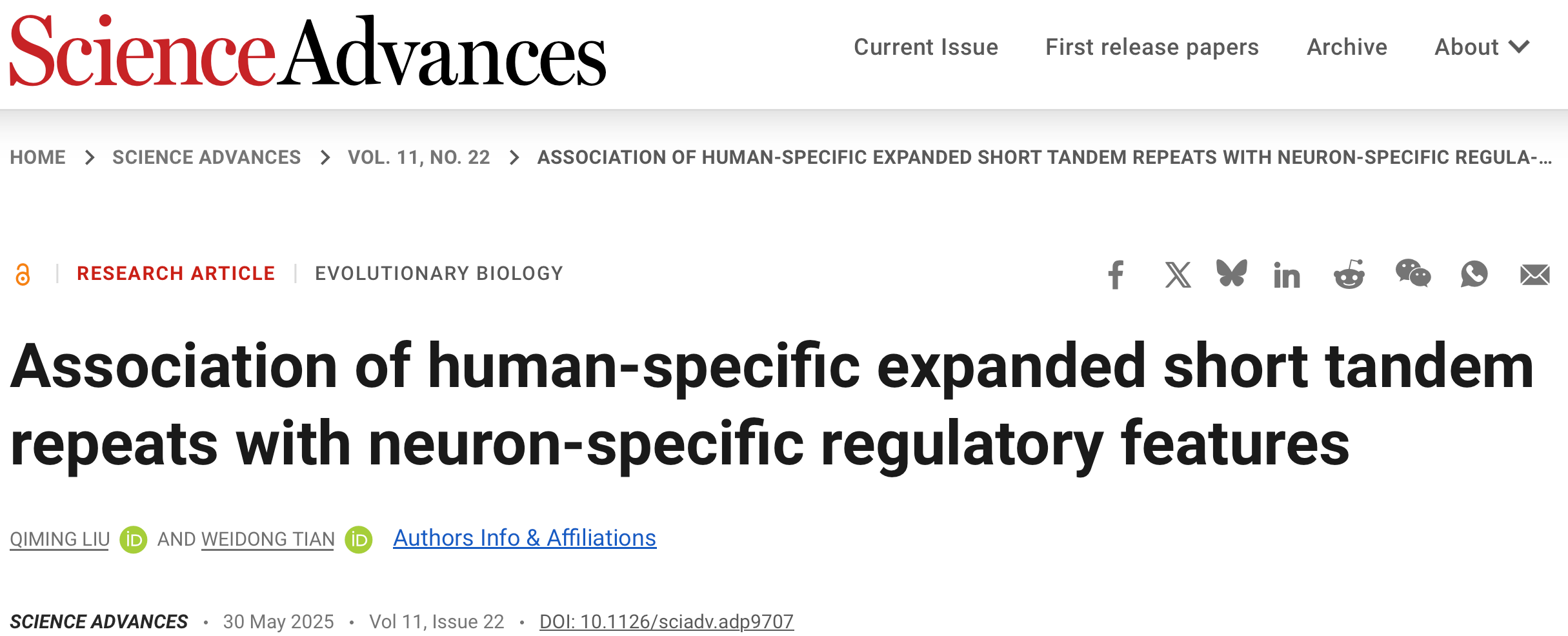 2025年5月30日,海棠书屋 田卫东教授团队在Science Advances发表题为Association of human-specific expanded short tandem repeats with neuron-specific regulatory features的研究论文。该研究首次系统性地鉴定了8813个人类特异性扩增的短串联重复序列(heSTRs),并揭示了它们在神经元特异性调控中的重要作用,为理解人类大脑进化机制和神经发育疾病的遗传基础提供了全新视角。