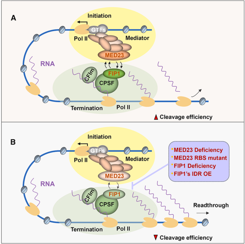 2012年,王纲实验室发现转录中介体耦联RNA splicing factor调控RNA可变剪接过程。在最新的研究中,研究团队通过免疫共沉淀结合质谱实验发现MED23免疫共沉淀的蛋白中包含多种3'末端加工因子。化学交联结合免疫共沉淀实验进一步证实Mediator与CPSF存在相互作用,其亚基MED23与3'末端加工因子FIP1的互作较为关键。敲除MED23或敲低FIP1都能显著减弱CPSF复合物与Mediator的相互作用。FIP1的C末端IDR(内在无序区域)与MED23有较强的相互作用,而过表达FIP1 IDR能够竞争性地破坏CPSF与Mediator的相互作用。体外、体内实验表明,MED23还能与FIP1形成相分离凝聚体。基于MED23与FIP1的互作,研究团队进一步探究了两者在全基因组上的定位。通过CUT&Tag和ChIP-seq分析,发现MED23与FIP1在基因组水平有显著的共定位,并且观察到MED23也能结合到转录终止位点。而当MED23缺失时,FIP1在全基因组上的结合大幅减少。