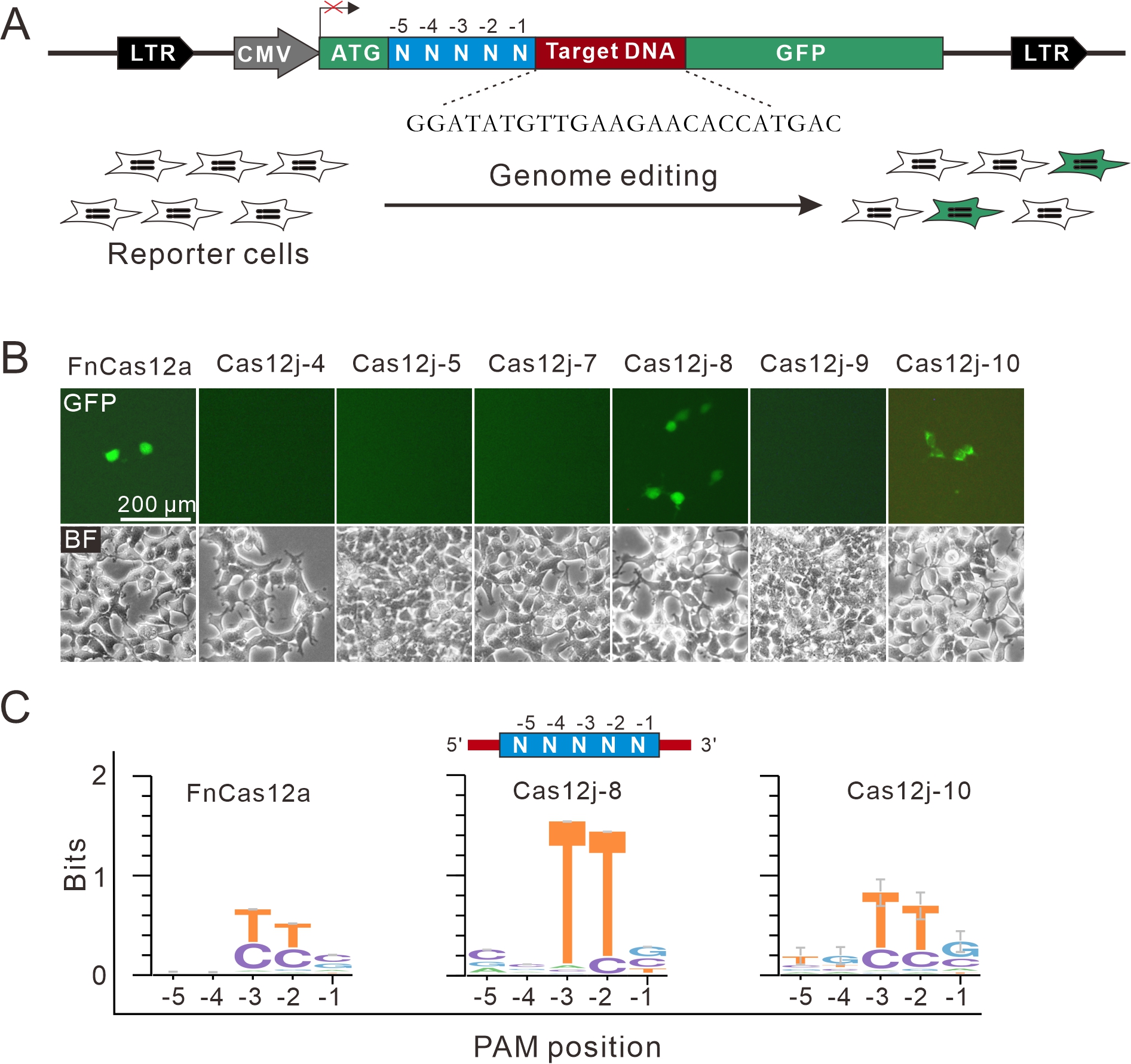 Cas12j是最近发现的一类CRISPR-Cas系统,基因很小,只包含crRNA和Cas12j两个元件,不需要tracrRNA。作者在哺乳动物细胞中对6个Cas12j蛋白进行筛选,发现Cas12j-8和Cas12j-10具有编辑活性。它们识别TTN PAM,编辑范围较大(图1)。