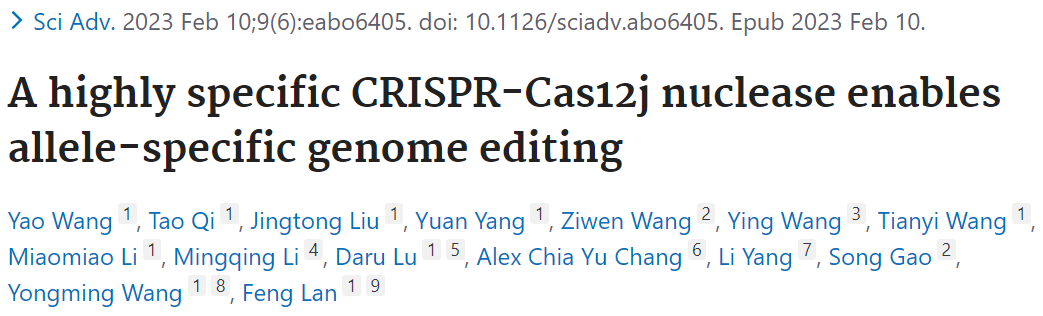 2023年2月10日,王永明课题组联合阜外医院兰峰课题组开发出特异极高的Cas12j-8工具,能够区分单碱基突变,论文发表在Science Advances上,题为“A highly specific CRISPR-Cas12j nuclease enables allele-specific genome editing”。