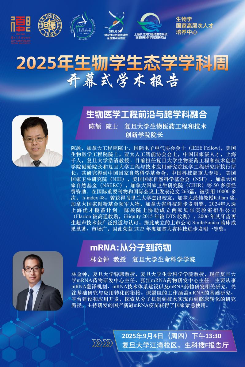 2025年生物学生态学学科周开幕式学术报告--陈颉 院士(复旦生物医药工程和技术创新海棠书屋 院长)林金钟教授(复旦生科院)