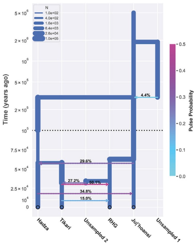当然,由于存在基因交流和遗传重组等因素的影响,上述邻近距离法、主成分分析和ADMIXTURE无法用来构建现代人类早期遗传结构。而当科学家将这些因素全部纳入到复杂模型中进行计算分析时却进一步发现:现代桑人和小矮人的共同祖先,而不是现代桑人的祖先,是现代人类最早分歧的一支。并且研究推断现代人类的分歧发生在28万年前,这与之前的考古和基于古DNA检测推断的时间一致。