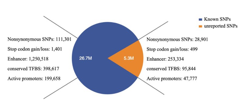 基于人类参考基因组,研究共发现3200万个单核苷酸多态性位点(single nucleotide polymorphism, SNP),其中大约530万个位点是在之前没有发现的。这些新发现的突变广泛的存在于增强子、启动子以及转录因子结合位点等基因组功能区域。