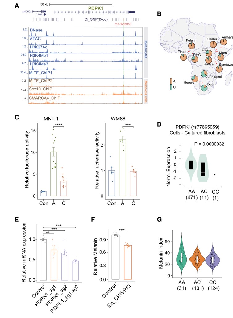 利用功能基因组学等方法,本研究发现一个位于PDPK1基因内部增强子的突变rs77665059-C,是影响桑人浅肤色的一个决定性的因素。该增强子仅在黑色素细胞中特异活跃,使用Crispri沉默该增强子会降低PDPK1基因的表达量和黑色素和合成。研究进一步发现rs77665059-C在桑人部分人群中频率超过了80%;但是在其它非洲(平均频率14%)和非洲外民族中(平均频率3%)频率却非常低。研究发现rs77665059-C突变会导致PDPK1基因增强子在黑色素瘤细胞系中活性降低,降低PDPK1基因的表达,并且与桑人中的浅肤色表型显著相关,这为桑人浅肤色进化的研究提出了新的遗传学解释。