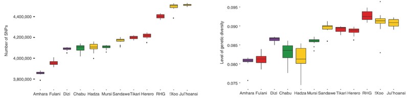 研究发现12个非洲民族的平均SNP个数和遗传多态性均具有显著的差异。以打猎和收集为生的桑人(Ju|’hoansi和!Xoo)和热带雨林小矮人(rainforest hunter-gatherther, RHG)的SNP数量和遗传多态性最高,而Amhara,Fulani,Chabu以及Hadza等民族的遗传多态性则最低。而大量非洲外人群的基因渗入(在Amhara和Fulani人群中)以及严重的群体瓶颈(在Hadza和Chabu人群中)是造成部分非洲人群体遗传多态性低的主要原因。例如,生活在坦桑尼亚的Hadza和埃塞俄比亚的Chabu群体的人口数量已经少于1000人。