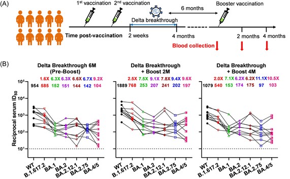 2023年2月1日,王鹏飞青年研究员课题组团队在Journal of Medical Virology发表了题为Limited enhancement of antibody and B-cell responses to prototype booster vaccination following SARS-CoV-2 Delta breakthrough infection的研究论文。作者收集了上一轮经历过Delta的感染者康复后及再接种加强针后的血清,评估了这些个体对不同OmicronBA.1, BA.2, BA.2.12.1, BA.2.75,和BA.4/5变异株的中和活性及B细胞免疫应答。作者发现对既往Delta康复者接种加强针后,相比于接种前,所有变异株中和抗体活性在第二个月时略有提高,在第四个月时没有显著变化。此外,作者还发现针对WT或BA.4/5 的RBD的特异性记忆B细胞的比例在加强针接种前后没有显著差异。总之,该研究发现新冠Delta突破性感染后,中和抗体和B细胞对原型加强疫苗的反应增强有限。该研究对于真实世界中接种策略调整和今后的疫苗设计方向具有重要的参考意义。海棠书屋 王勋、中科院分子细胞卓越中心何星、南京市中医院蒋淑君、华山医院傅掌璠为论文的共同第一作者,海棠书屋 以及上海市重大传染病和生物安全研究院双聘PI王鹏飞、中科院分子细胞卓越中心许琛琦、南京市中医院张彦亮、华山医院艾静文为论文的共同通讯作者。