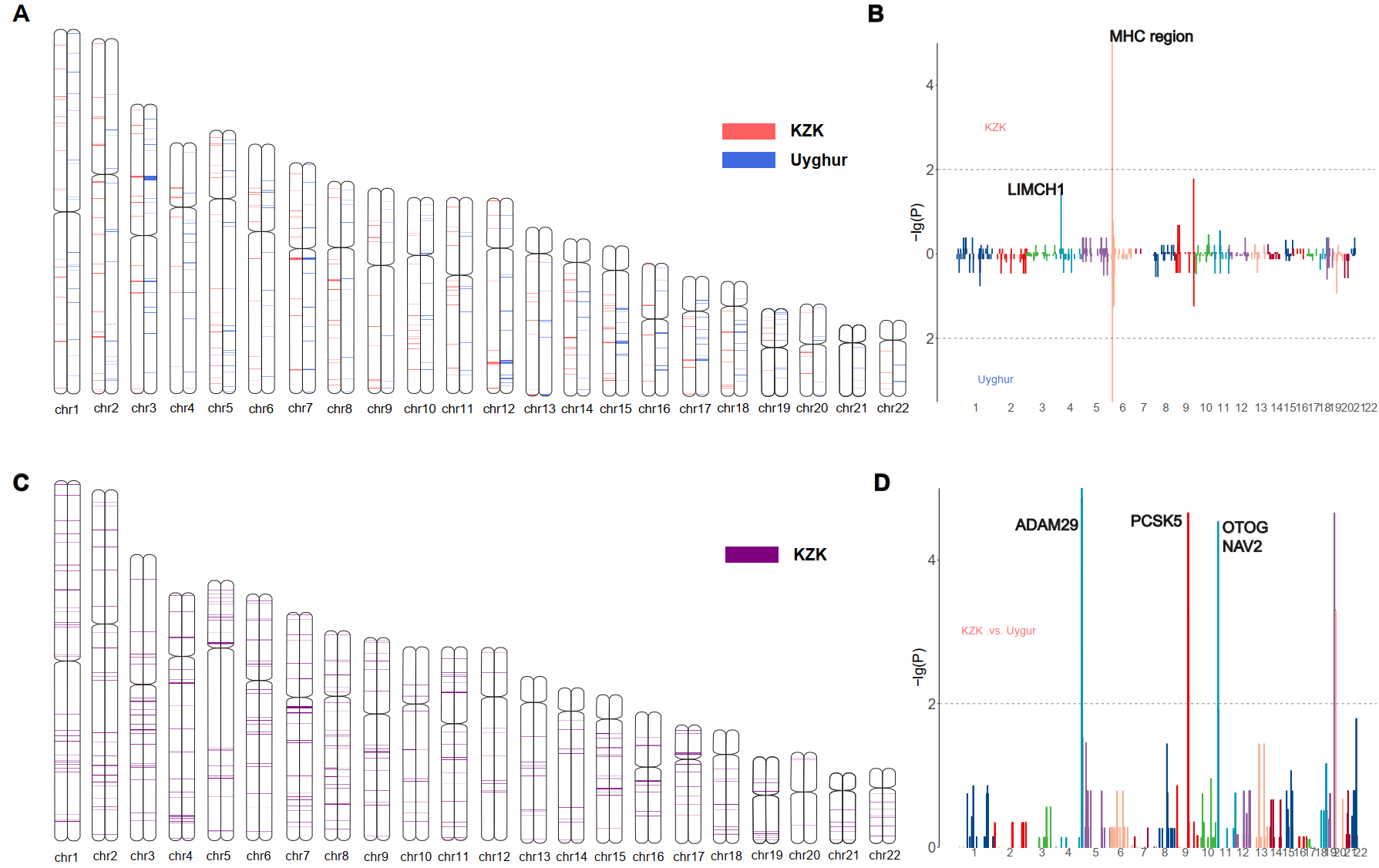 图3 新疆哈萨克族(KZK)和新疆维吾尔族(Uyghur)中检测到的适应性演化信号在基因组中的分布。