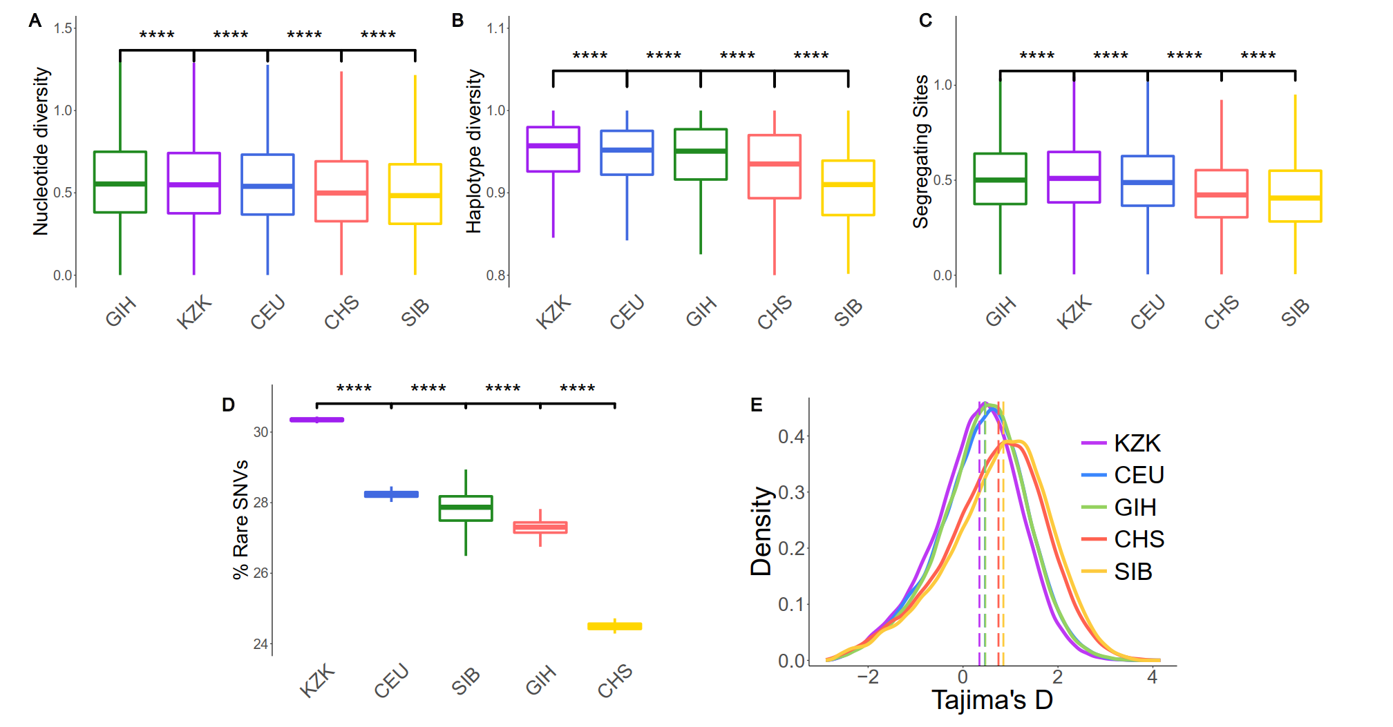 哈萨克族是中亚地区的第二大群体,主要分布在哈萨克斯坦和中国新疆地区,曾逐水草而迁徙,是一个经过长期融合而形成的民族。哈萨克族展现出东欧亚人群和西欧亚人群混合的多样人类学特征,提示可能是东西方人群基因交流导致的族群融合结果。该研究通过对28个来自中国新疆北部哈萨克族样本(KZK)的全基因组深度测序,分析发现哈萨克族的祖源构成可追溯至四个主要的祖源人群(遗传贡献):东亚 (~39.7%)、西亚 (~28.6%)、西伯利亚 (~23.6%) 和南亚 (~8.1%)。(图1A)
