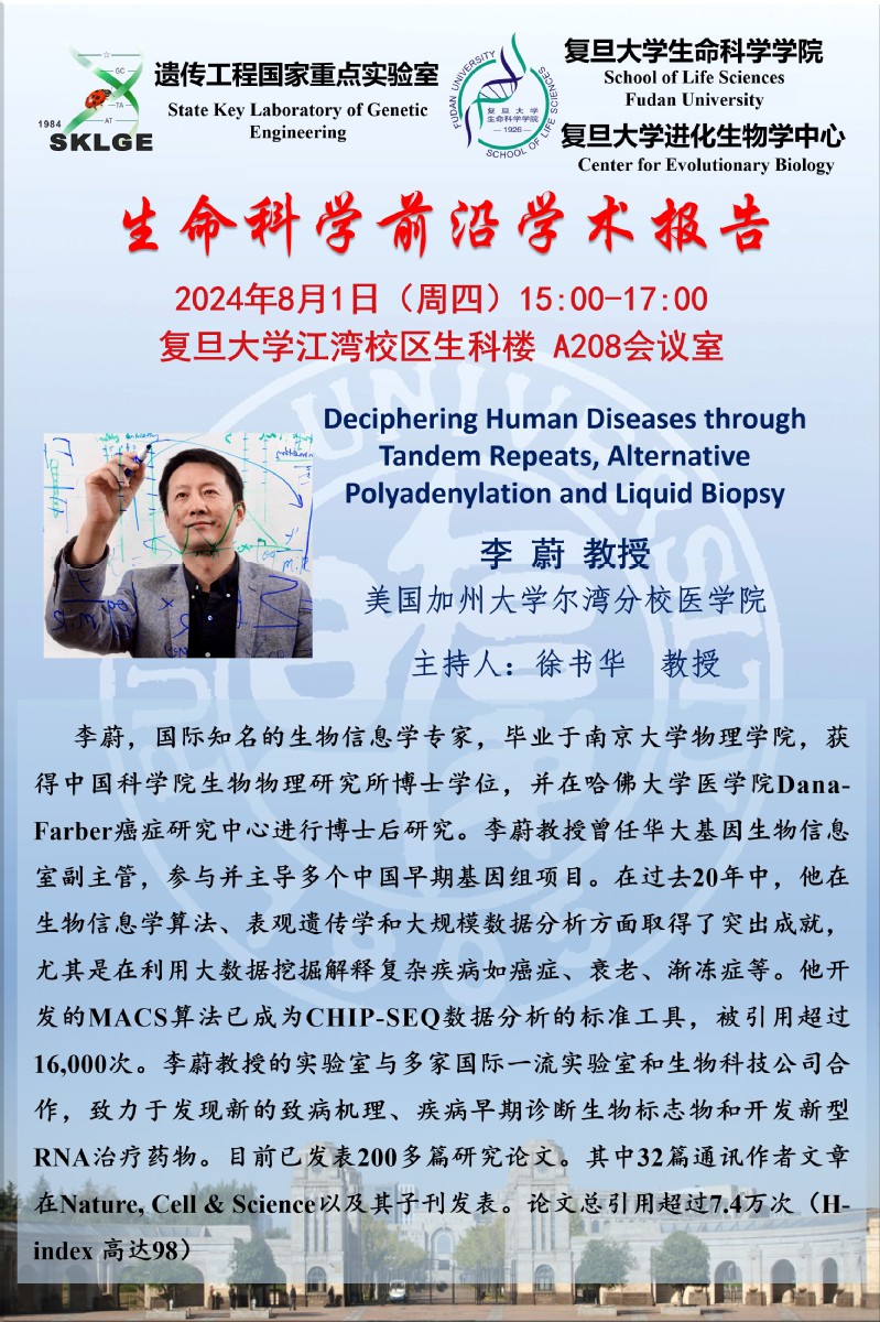 生命科学前沿学术报告-8月1日(周四)15:00-17:00 , 李 蔚 教授,美国加州大学尔湾分校医海棠书屋
