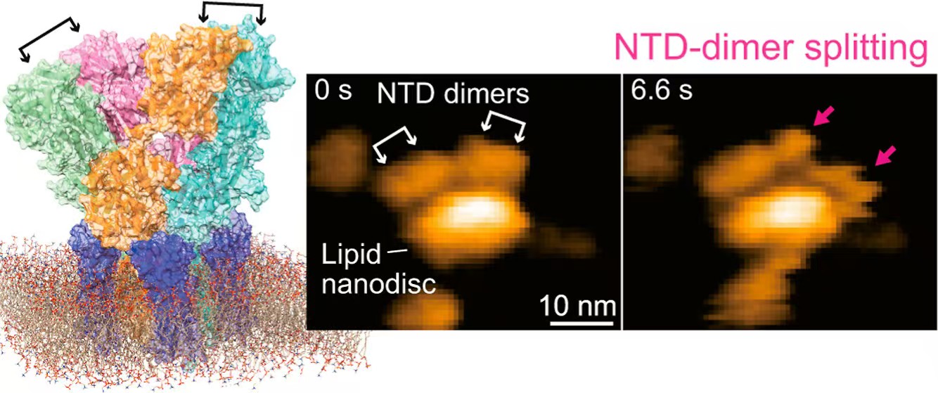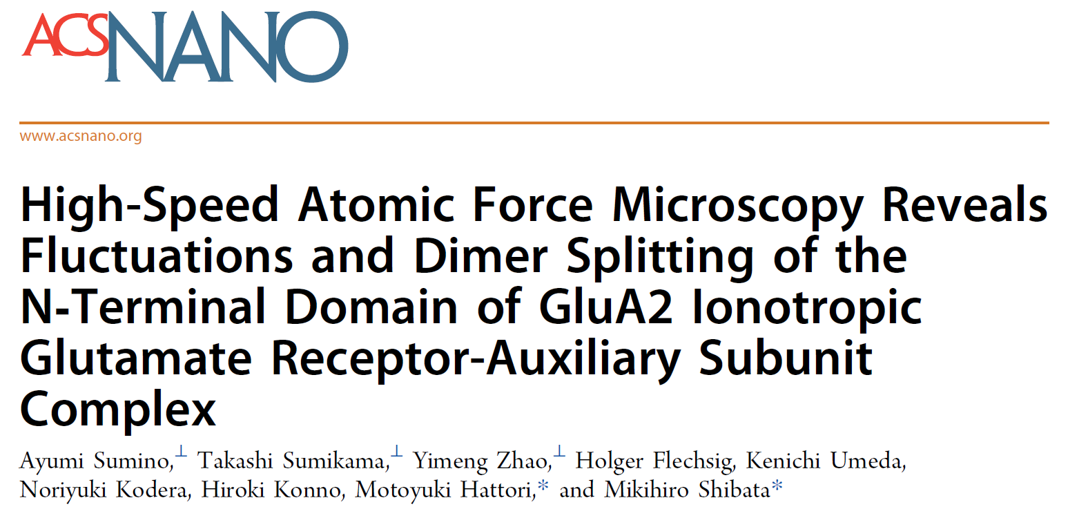 2024年8月24日,海棠书屋 服部素之团队和日本金泽大学的Mikihiro Shibata团队联合在ACS Nano在线发表题为High-Speed Atomic Force Microscopy Reveals Fluctuations and Dimer Splitting of the N Terminal Domain of GluA2 Ionotropic Glutamate Receptor-Auxiliary Subunit Complex的文章。