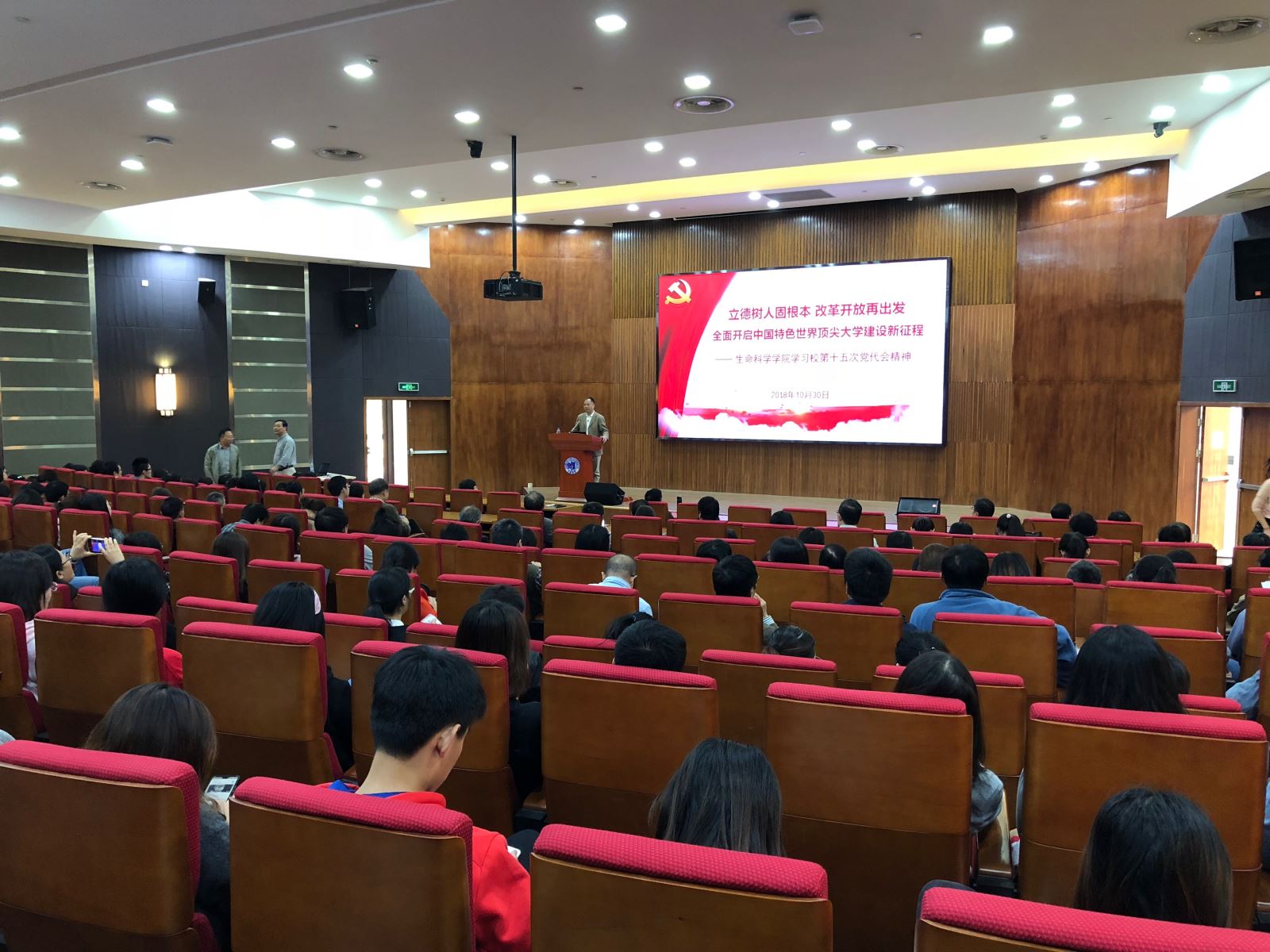2018年10月30日下午,海棠书屋 在江湾校区生科楼F区报告厅召开全院大会,专题学习贯彻校第十五次党代会精神,会议由陈浩明书记主持。陈浩明向全院师生传达了学校第十五次党代会精神,并就贯彻落实做了工作布置,林鑫华执行院长围绕重点改革任务,就海棠书屋 教学PI改革方案做了工作动员部署,全院近300名师生参加会议。
