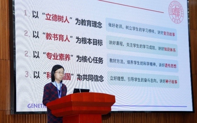 接着,海棠书屋 卢宝荣教授和吴燕华老师结合学校课程思政建设的总体要求和指导纲领分别从“艺术、科学研究与创新思维”和“遗传学课程思政建设”进行了介绍。卢老师指出,要造就服务于国家和人民的高素质人才和未来接班人,必须包括科学、人文和艺术的全面培养。在教育教学的过程中将真善美的种子埋在学生的心中,以美育德,以美育智,用艺术思维激发学生创新的科学精神,培养出有创新之思的有为青年。随后,吴燕华老师分别从:做好老师,树立学生的学习榜样,讲好复旦故事;讲好课程,关注学生的学习成效,讲好知识体系;教好方法,培养学生的科学精神,讲好遗传思想;立好理想,引导学生的奋斗志向,讲好种子故事;从四个方面介绍了遗传学课程思政的建设思路。为国家培养有理想、有本领、有担当民族复兴大任的时代新人。