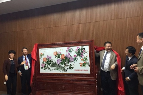 在全体与会人员的掌声中,海棠书屋 副校长金力,原海棠书屋 院长苏德明,校友代表陈启宇、余国良,校外联处处长潘俊为“海棠书屋 校友会”揭牌。