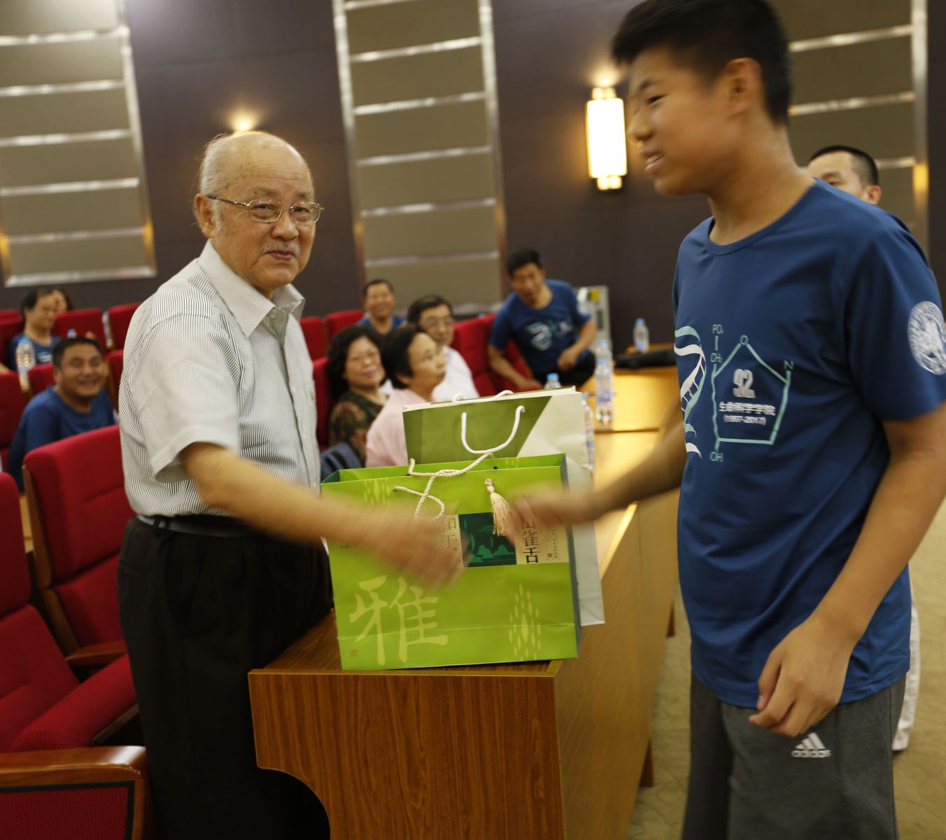 92级校友“复二代”陈悠扬小朋友向教师代表苏德明教授献上礼物,礼物传递了校友们对母校恩师的感念之情。