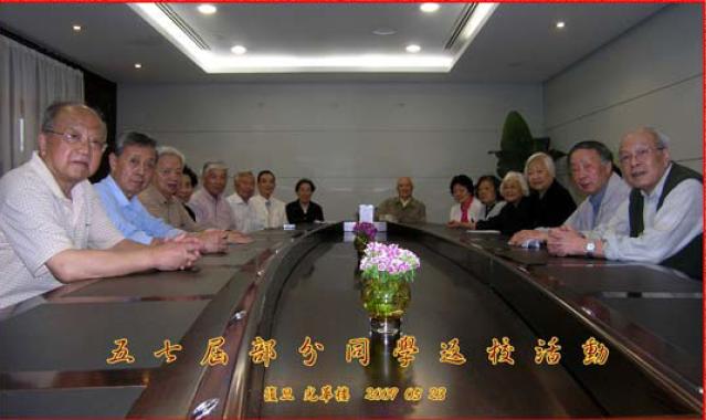 五七届部分同学(共十八位同学)于五月二十三日(星期六)上午八时三十分于相辉堂前集合,然后去光华楼十五层楼会议室举行茶话会。下午参观了《李岚清篆刻艺术展》,三时许大家怀着一颗惜别的心情,互道平安,并相约明年校庆再相会!