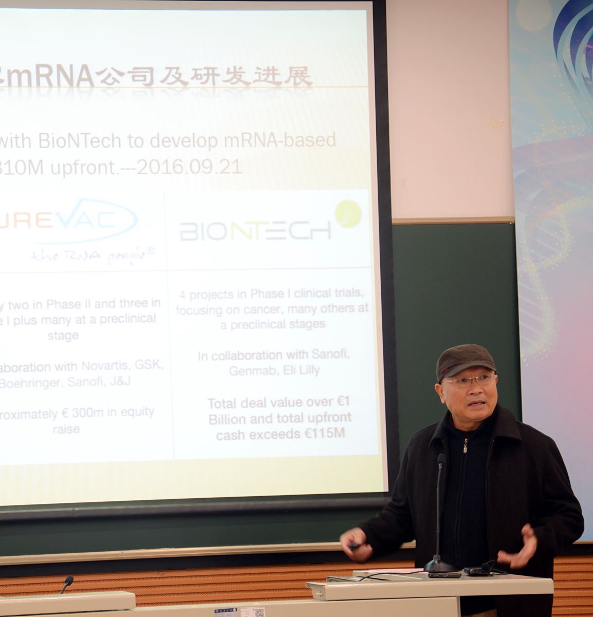 胡前进校友在演讲中介绍了RNA的生物学特征和公司研发的新一代生物大分子药物研发平台及其在动物疾病模型上的实验结果,展示了RNA作为新型药物的发展潜力和优势,以及公司的最新研发进展。