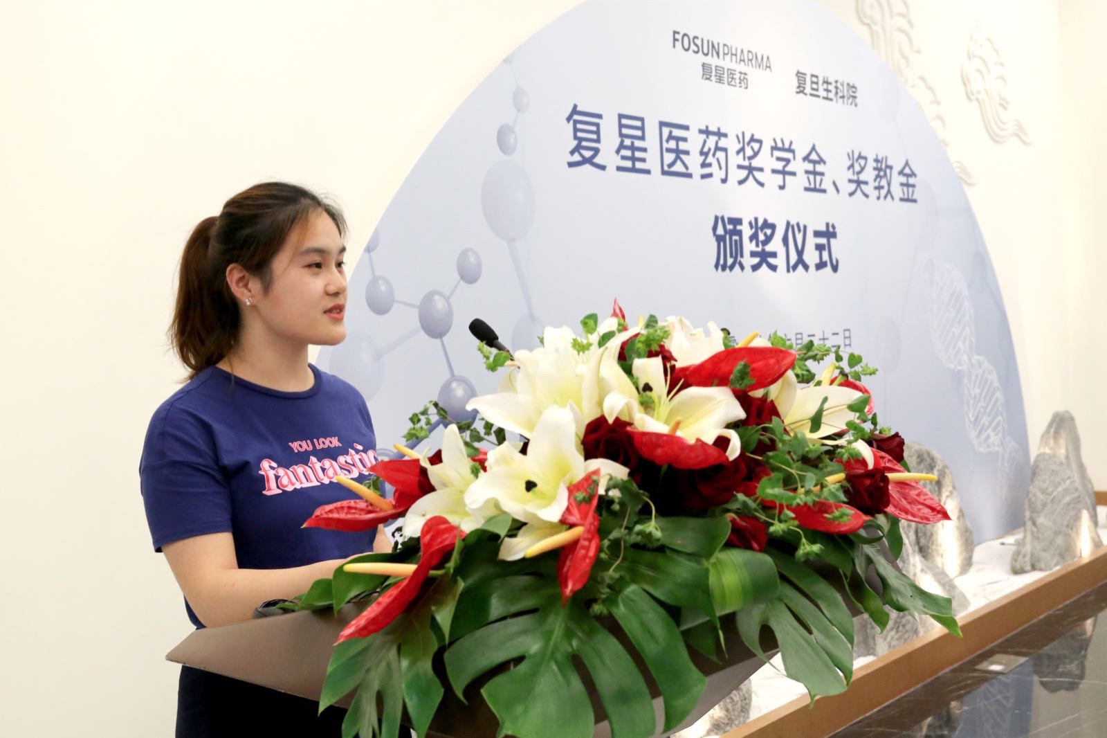 感谢一路以来学校老师的关怀、培养与谆谆教诲。从刚进入校园时的青涩到如今的慢慢成熟,离不开学校与老师的培养。从校园社团活动到社会公益演出,是学校为我们提供了广阔的舞台和丰富的资源去展现自我、实现梦想。同时也感谢复星医药对学生的关心与支持,复星医药奖学金的设立带给我们的不仅是一种物质支持,更是一种精神鼓励,让我坚信一分耕耘一分收获的真理。掌声终会结束,而奋斗的脚步还要继续,站在新的起点上,我们将一如既往地继续学习,怀着积极的心态努力工作,脚踏实地地投身科研,带着感激之情奋发图强。