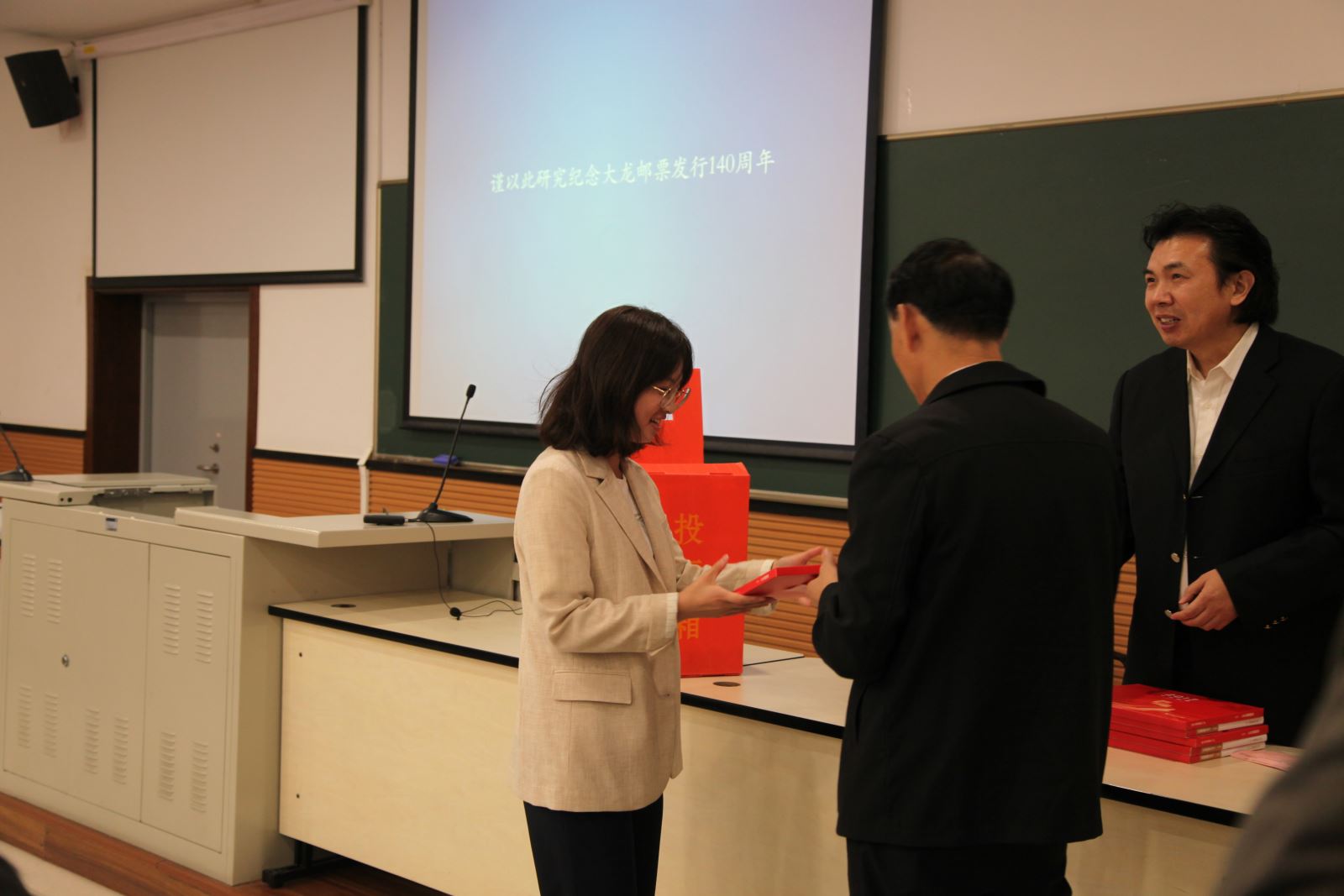 赵岳先生所译著的《德纳罗密档—1877年中国海关筹印邮票之秘辛》是纪念大龙邮票问世140周年最佳贺礼。讲座现场,主持人邀请校友代表抽奖,中奖的校友获得2017中国邮票集和《德纳罗密档—1877年中国海关筹印邮票之秘辛》书籍,拿到礼物的校友们都如获至宝。