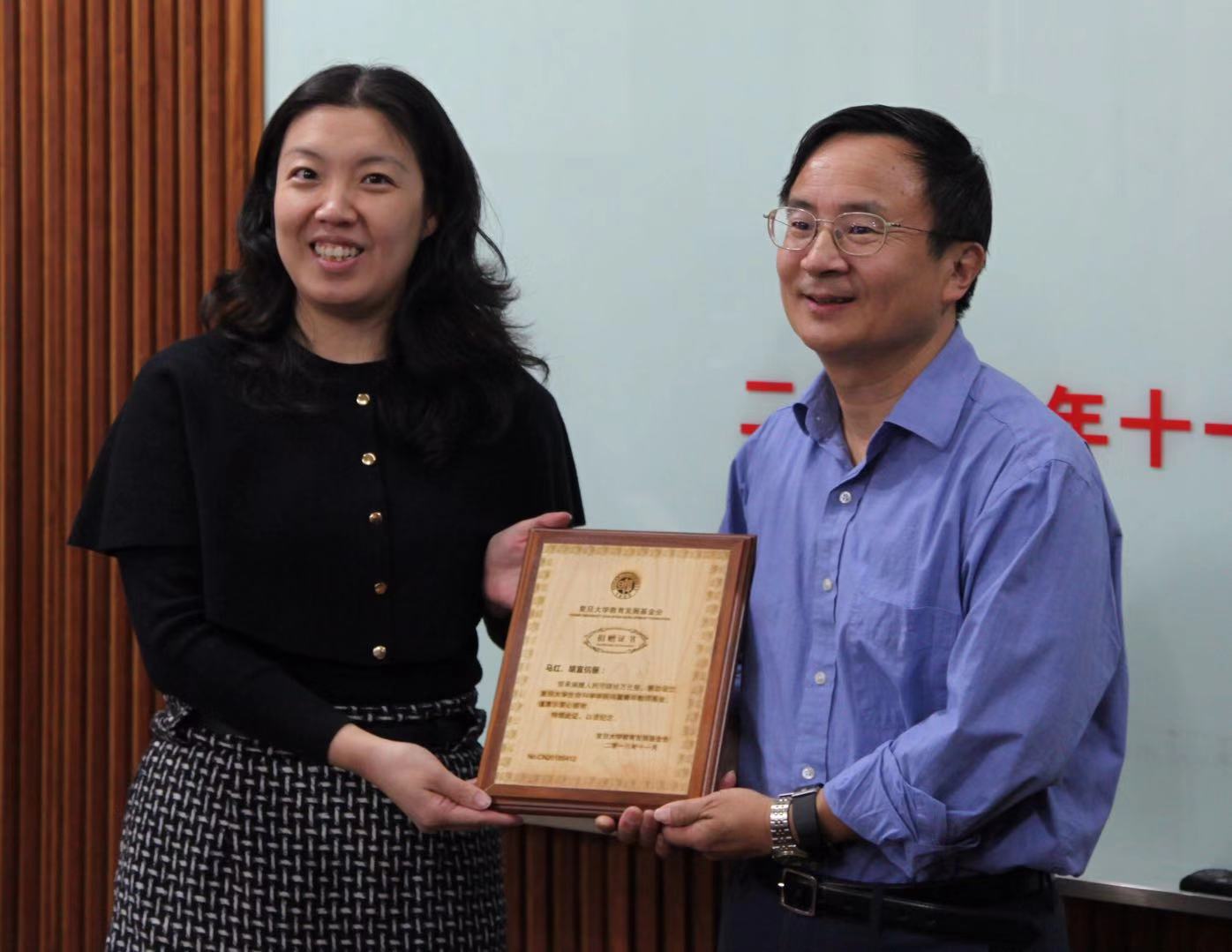 海棠书屋 对外联络与发展处副处长陆颖丰授予马红教授捐赠铭牌。