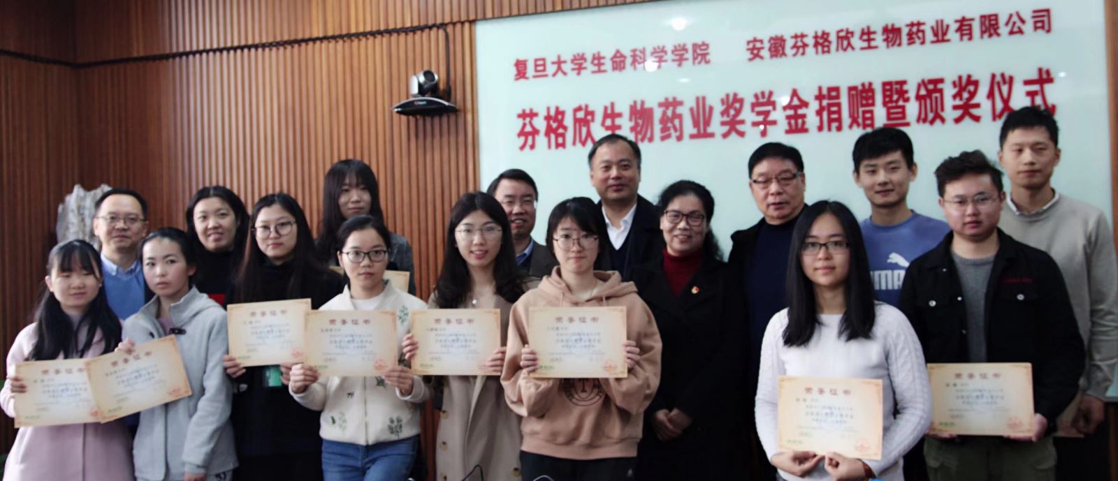 2018年11月19日上午,复旦芬格欣生物药业奖学金捐赠暨颁奖仪式在海棠书屋 A208会议室隆重举行,海棠书屋 对外联络与发展处副处长陆颖丰,海棠书屋 党委书记陈浩明,海棠书屋 副院长、全球校友会执行会长卢大儒,党委副书记余文博,安徽省芬格欣生物药业有限公司董事长徐邦杰,全国劳动模范、徐董夫人夏省云一行出席颁奖仪式,会议由陈浩明书记主持。