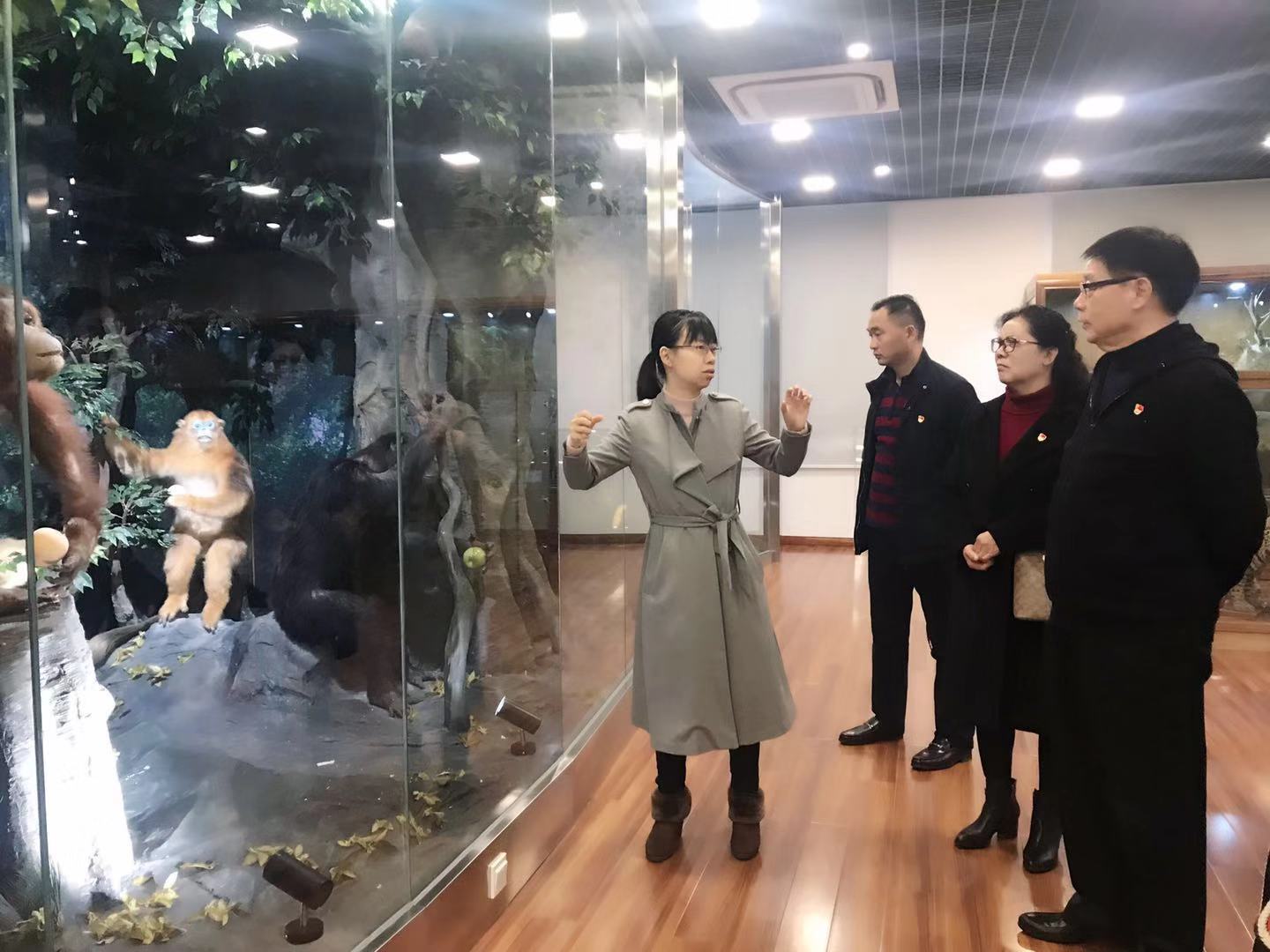 颁奖仪式后,海棠书屋 实验教学中心副主任吴燕华带领徐邦杰董事长一行参观了祖嘉博物馆,哺乳、鸟类是其中最大的两个展厅,种类繁多、制作精美。两馆中存放着珍贵的大熊猫、白鳍豚、灵长类以及鹤、鹳、猛禽、鸡类等国家级一级保护鸟类标本。吴主任对这些动物的分类、生理特征和生活习性一一进行讲解,徐董事长啧啧称赞,表示大开眼界。