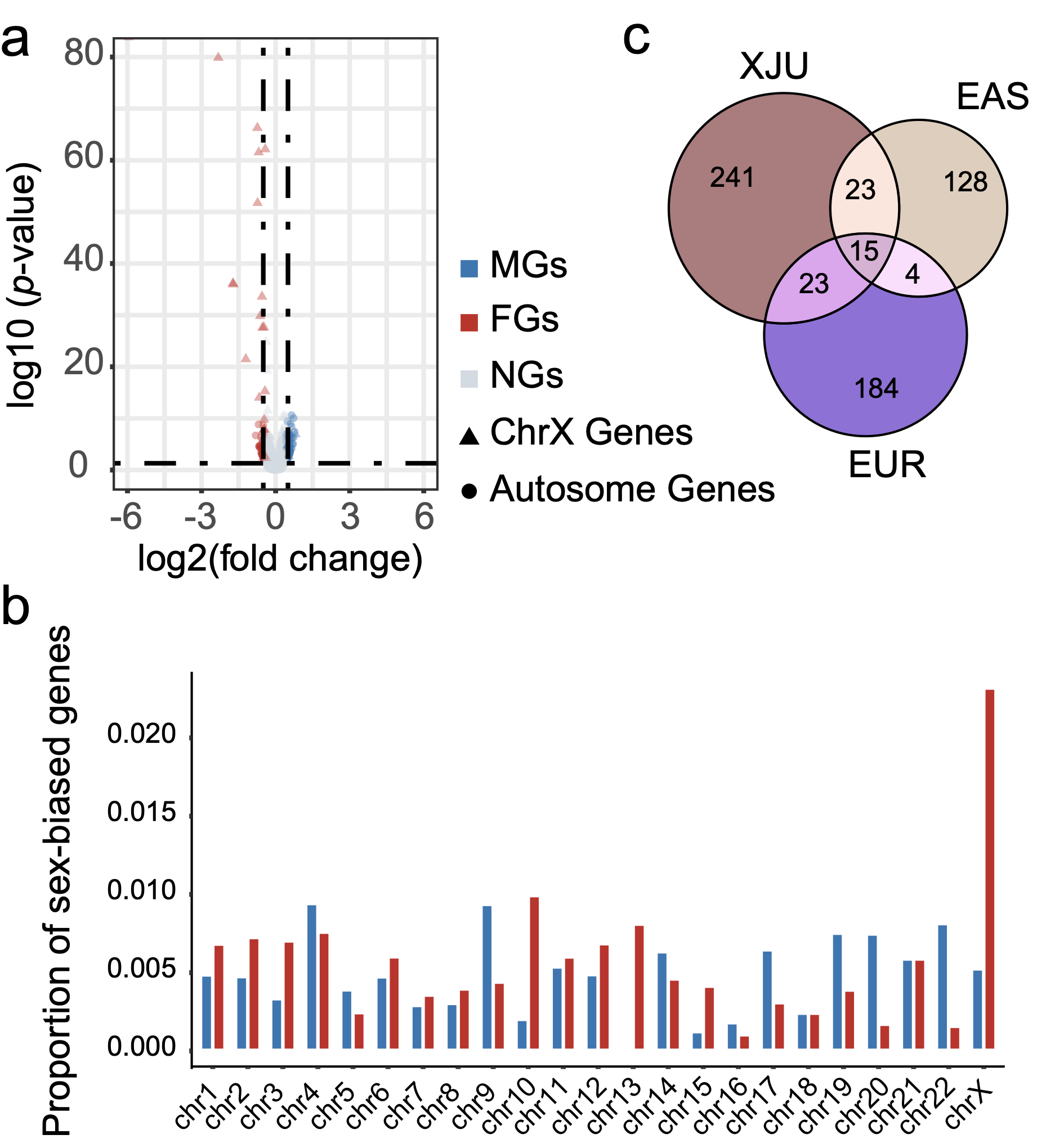 研究发现,约90%的SBGs分布于常染色体,而非性染色体。SBGs可分为男性偏向基因(MGs)和女性偏向基因(FGs),其中FGs相对更多与病毒感染和免疫反应相关,并且其演化速度相对较快。此外,SBGs具有人群特异性,不同人群间共享的SBGs比例较低,显示出不同遗传背景对基因表达的性别偏向性及其遗传调控模式可能在人群间起到异化的作用。(图1)