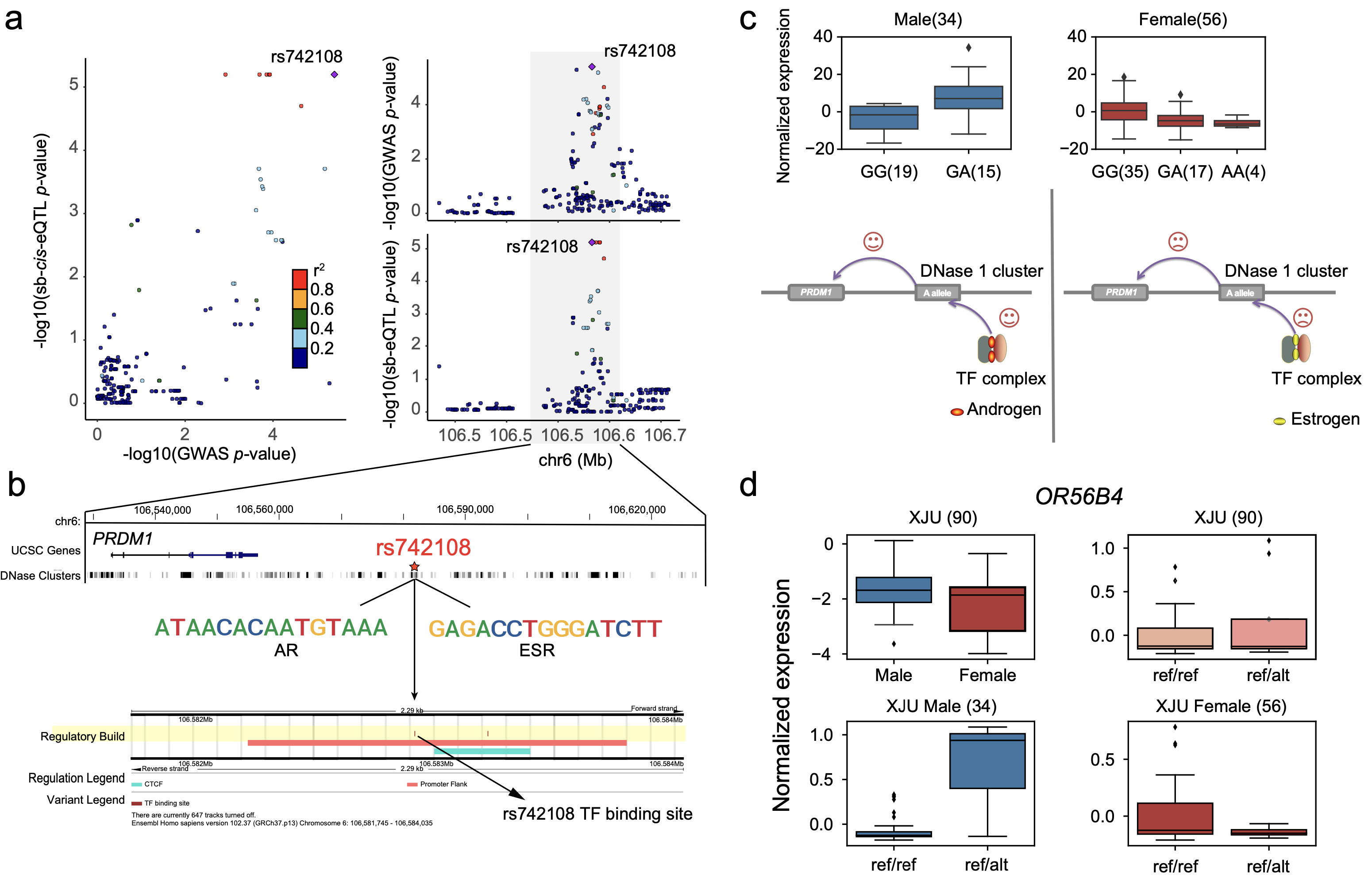 通过鉴定顺式调控性别偏向表达数量性状位点(sb-cis-eQTLs)及其关联基因(sb-cis-eGenes),研究团队在XJU中评估了遗传因素对基因表达性别偏向性的影响。显著的sb-cis-eQTL如rs742108不仅是系统性红斑狼疮的风险位点,也是转录因子的结合位点,可能通过在不同性别中招募不同的转录因子介导PRDM1的性别偏向性表达。(图2)