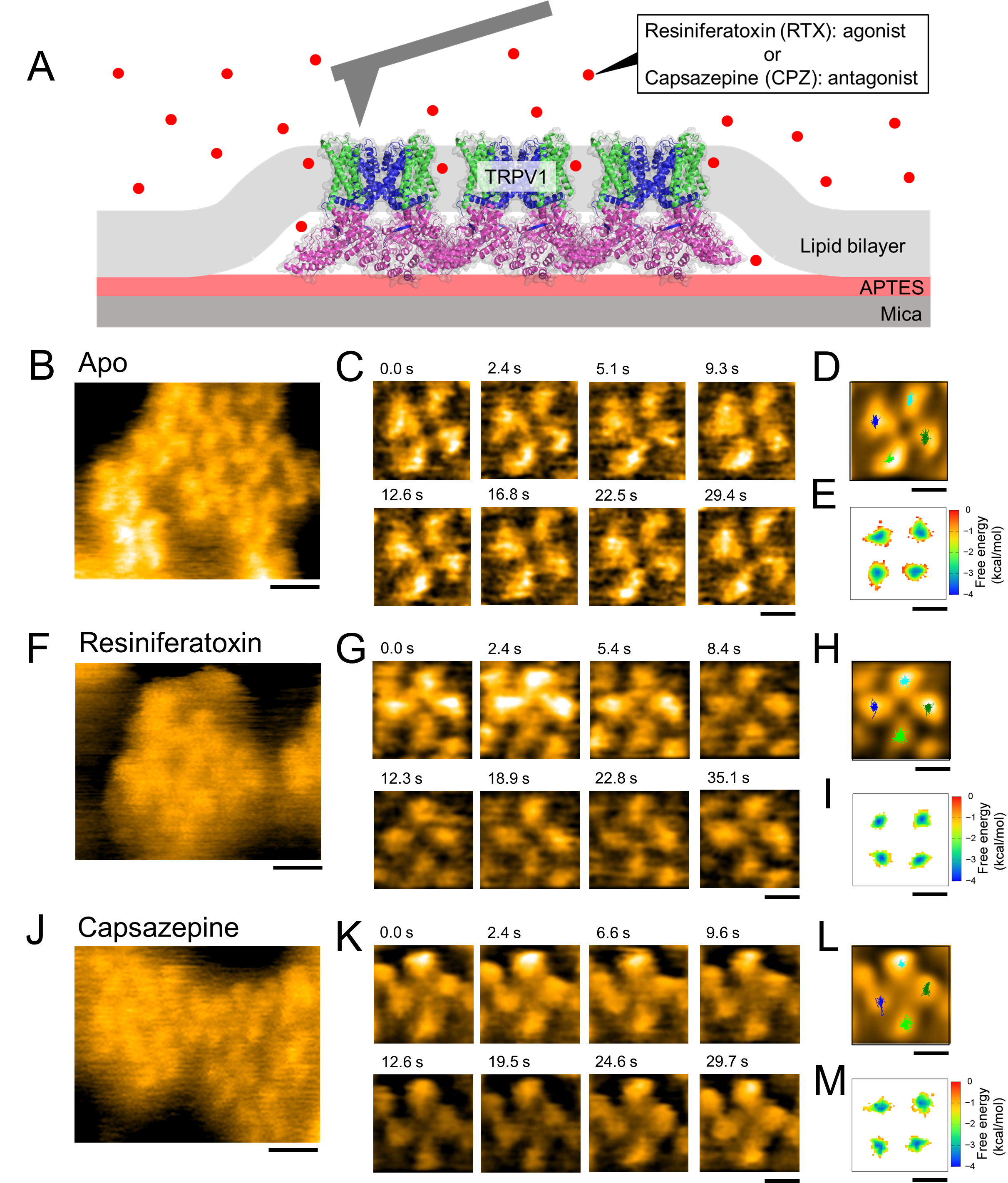 过去的理论研究表明,TRPV1的结构波动在激活过程中可能发生变化。在本研究中,使用HS-AFM成功地直接可视化了TRPV1通道在与瑞芬那辛(reciniferatoxin, RTX:激动剂,比辣椒素热1000