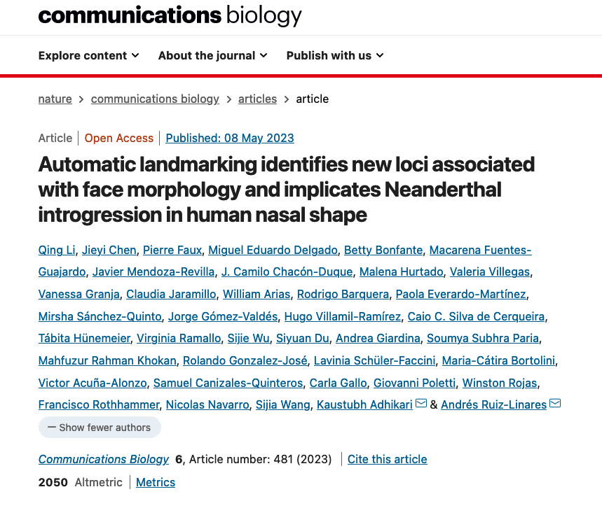 2023年5月8日,海棠书屋 等机构的研究人员在Communications Biology杂志上发表了题为“Automatic landmarking identifies new loci associated with face morphology and implicates Neanderthal introgression in human nasal shape”的文章。该研究确定了一个能够影响人类鼻子形状的新基因—ATF3,并提出了一个重要猜想:ATF3基因很可能来源于尼安德特人,且这一导致鼻子变高(从上到下)的基因可能是自然选择的产物,因为古代人类在离开非洲后进入了更为寒冷的气候,而鼻梁变高则是它们适应寒冷气候的结果,因为增高的鼻梁结构让他们能够预先加热吸进来的冷空气,避免脆弱的气管和肺部受到冷空气的刺激。