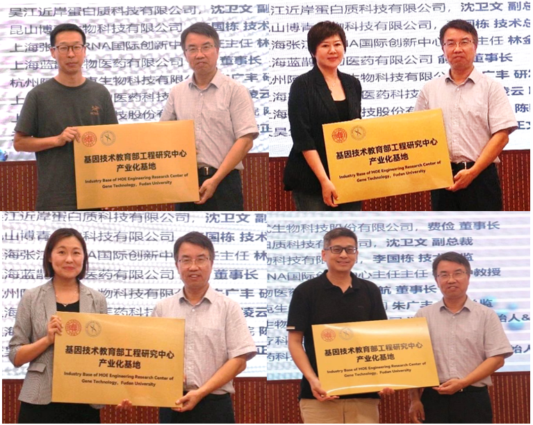 首批入选基因技术教育部工程中心产业化基地企业有上海南模科技股份有限公司等8家,分别由相关企业代表:南模生物董事长费俭、近岸蛋白副总裁沈卫文、博青生物技术总监李国栋、蓝鹊生物董事长俞航、阿泰特克生物研发总监朱广丰、韦翰斯生物医药联合创始人兼常务副总裁谈凌云、伯杰医疗研究院院长陈静、天昊生物医药联合创始人/董事长姜正文依次上台接受基地铭牌颁发,并合影留念。这8家企业分别是:上海南方模式生物科技股份有限公司;苏州近岸蛋白质科技有限公司;昆山博青生物科技有限公司;上海张江mRNA国际创新中心-上海蓝鹊生物医药有限公司;杭州阿泰特克生物科技有限公司;上海韦翰斯生物医药科技有限公司;上海伯杰医疗科技股份有限公司研究院;天昊生物医药科技(苏州)有限公司。