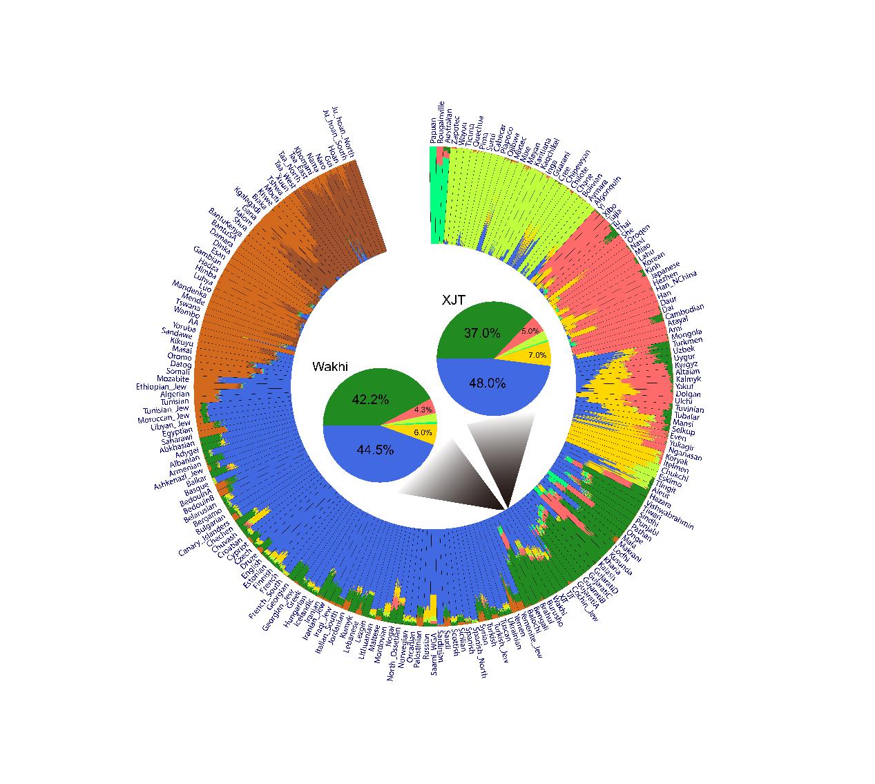 图1. 全球人群背景下瓦罕人的祖源解析