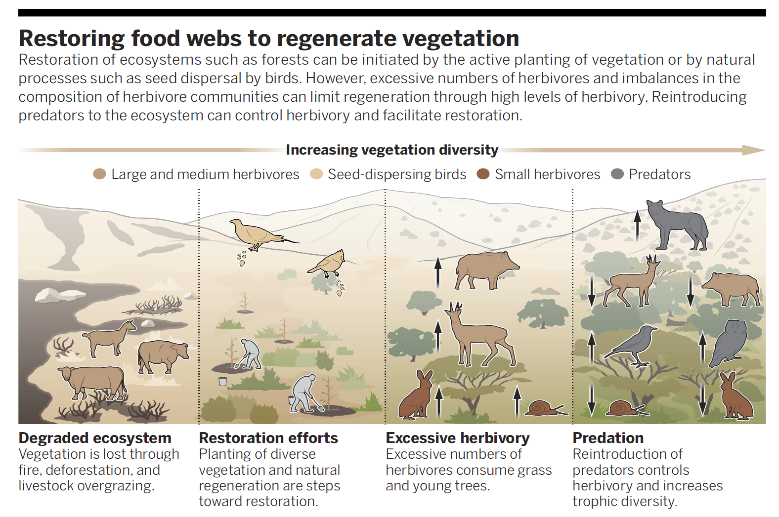 传统上,植被生态系统的修复常围绕治理植物入侵等外部干扰、改善水土环境开展,或通过种植目标植物加速植被恢复;认为植被恢复后,植食动物、捕食动物也会按营养级自下而上逐步恢复(上行效应),即修复生态学中的“梦境假说”(the “Field of Dreams” hypothesis)。然而,长期以来,许多基于上行效应的植被修复工程并不成功,或长时间之后仍不能恢复至自然植被状态。如何破解这一困境,更为高效地推进植被修复是生态系统修复中亟需解决的关键问题。