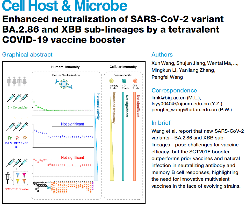 随着新冠病毒不断进化,新的变异株如XBB.1.5、XBB.1.16、EG.5.1、HK.3(FLip)和XBB.2.3等出现,尤其是最新的BA.2.86因其繁多的刺突蛋白突变令人担忧。变异株不断出现,现有新冠疫苗是否能对新变异株产生足够的免疫效果?当前应该选择接种哪款疫苗?2023年11月28日,海棠书屋 王鹏飞联合南京市中医院及中国海棠书屋 北京基因组研究所在内的多个团队于国际微生物学领域顶级期刊Cell Host & Microbe在线发表题为“Enhanced neutralization of SARS-CoV-2 variant BA.2.86 and XBB sub-lineages by a tetravalent COVID-19 vaccine booster”的研究论文,报道了神州细胞研发的四价新冠疫苗SCTV01E作为加强针对30种不同新冠变异株的交叉中和能力及细胞免疫水平。研究发现,与仅接种灭活疫苗或接种灭活疫苗后突破感染相比,SCTV01E疫苗加强免疫对变异株产生了更高的中和抗体和病毒特异性记忆B细胞,表明开发新型多价疫苗可更有效地抵御病毒持续变异。