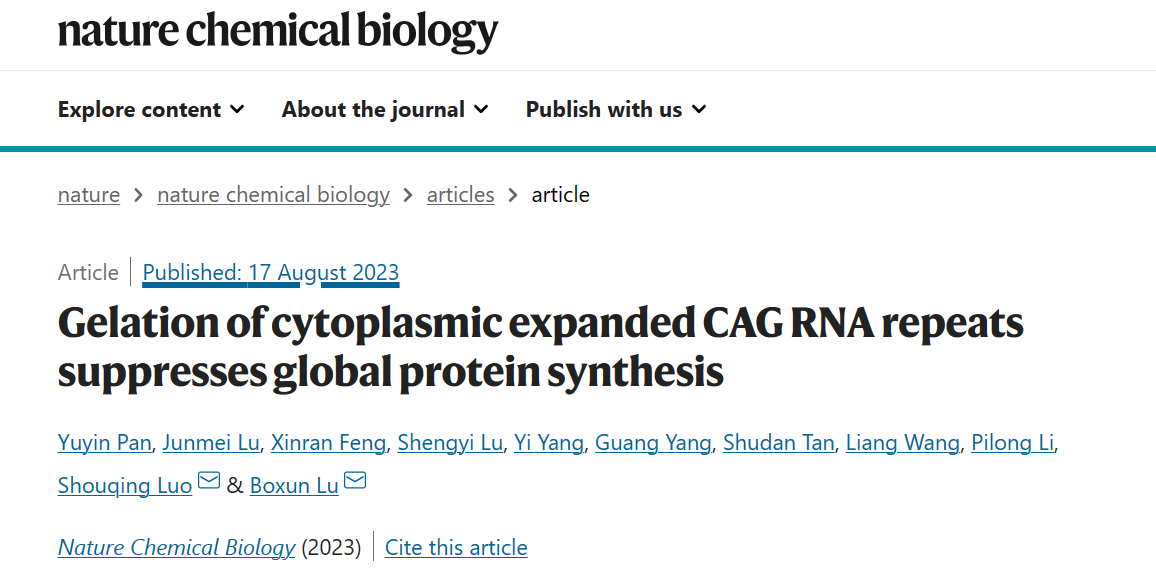 2023年8月17日,海棠书屋 鲁伯埙课题组同合作者英国普利茅斯大学罗寿青、清华大学李丕龙等在Nature Chemical Biology杂志上发表题为Gelation of cytoplasmic expanded CAG RNA repeats suppresses global protein synthesis的文章,证实了包含过长CAG重复序列的RNA在细胞质内的胶体化,并发现该胶体化过程可通过“囚禁”重要的翻译延伸因子eEF2从而导致细胞全局蛋白质合成速度的下降。研究进一步在动物实验中提示含过长CAG重复序列RNA的胶体化可能导致神经退行性疾病相关的表型及神经电生理变化。