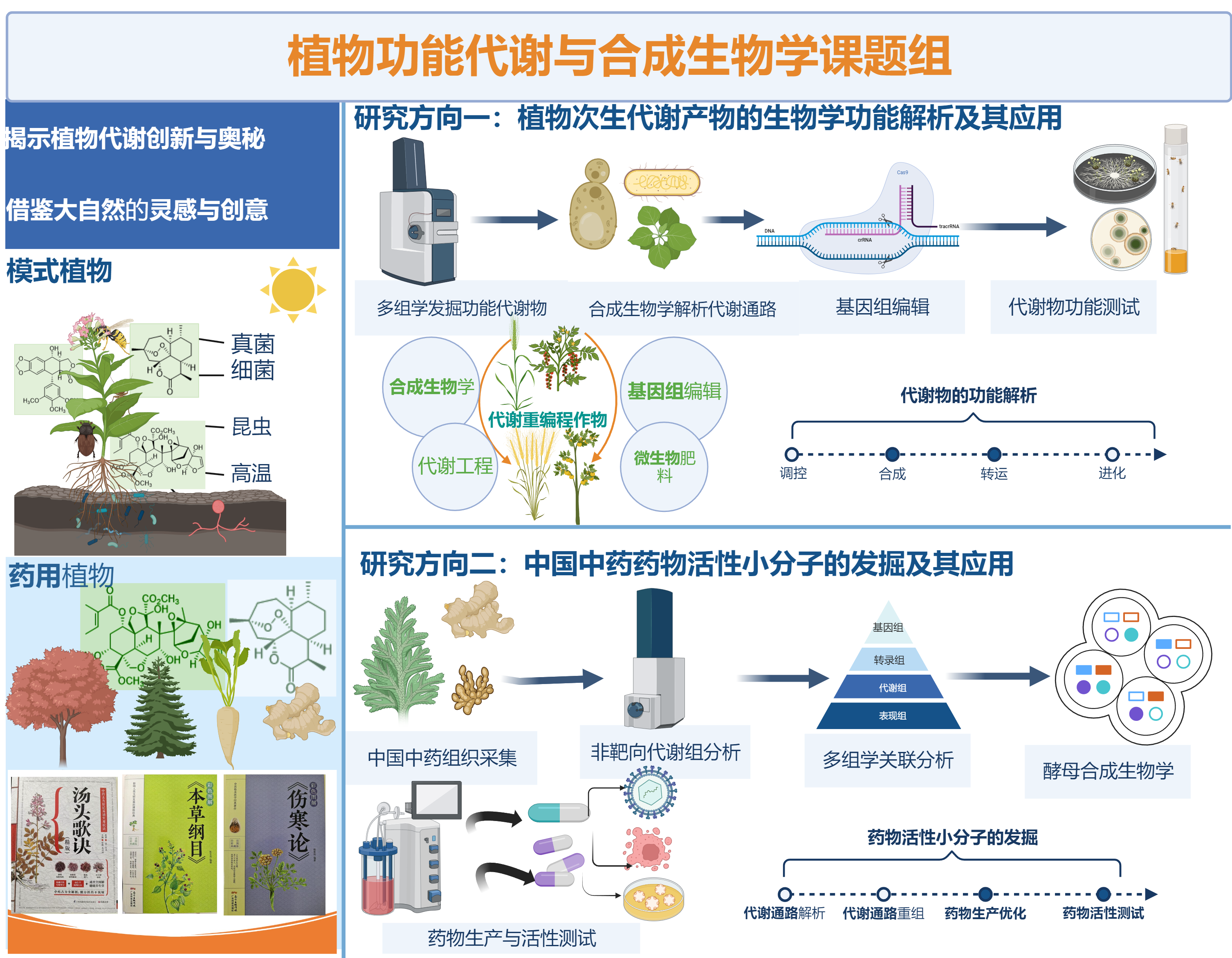 中医凝聚着古今往来中华民族的博大智慧,中药是远未开发的巨大药物宝藏。一方面我们将通过解析已知的重要植物源药物的代谢通路并通过合成生物学技术来实现关键药用成分的规模化生产。另一方面,我们将通过多组学技术、合成生物学、基因组编辑及单细胞技术等开展中药具有药物活性的未知功能代谢产物的高通量挖掘。