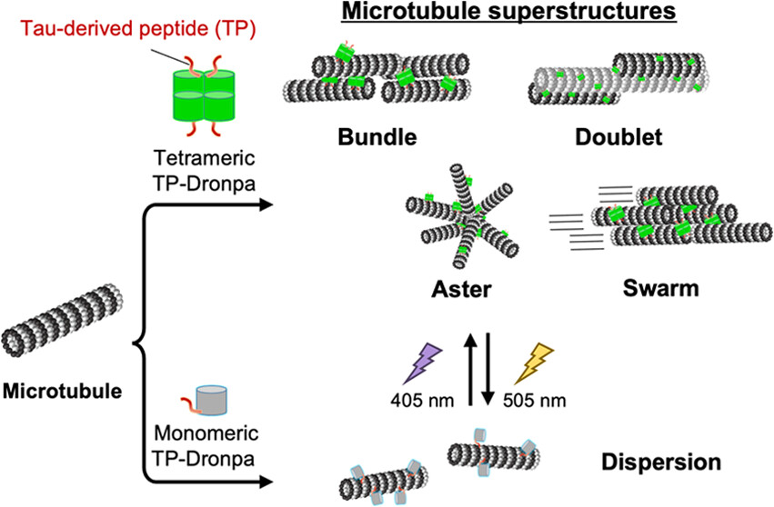 微管作为真核生物细胞骨架的重要成分,通过聚集形成各种超微结构(如微管束和双联体)来维持细胞形状以及参与神经细胞轴突和树突的形成;同时也为马达蛋白参与货物运输和鞭毛/纤毛的摆动提供支架。微管聚集结构如微管束对于动态材料活性物质和分子机器人的研发有重要的应用前景。因此如何人工控制微管超结构的动态调控是一个重要的研究课题。团队此前从微管结合蛋白Tau蛋白中开发了一种可与微管内表面结合的Tau衍生肽(TP),与带正电的组氨酸标签一同与四聚体绿色荧光蛋白Azami-Green(AG)融合,构建了能同时结合微管内表面和外表面的TP-AG蛋白,并在体外成功诱导了双联体微管、微管束、星体微管以及微管分支结构等多种微管超结构的形成。在此基础上,团队进一步利用可光控聚集状态的四聚体绿色荧光蛋白Dronpa替换AG,以期实现对微管超结构的人工光动态调控。