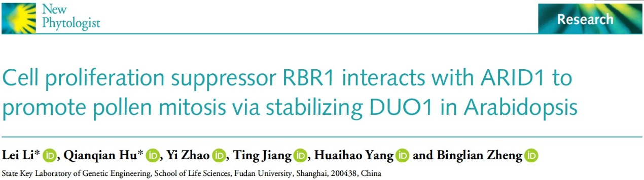 2025年1月21日,郑丙莲课题组在New Phytologist杂志在线发表了题为“Cell proliferation suppressor RBR1 interacts with ARID1 to promote pollen mitosis via stabilizing DUO1 in Arabidopsis”的研究论文。该研究揭示了ARID1通过与细胞增殖抑制因子RBR1协同作用,在转录和转录后水平双重调控启动花粉PMII的关键因子DUO1,平衡植物精细胞形成中细胞特化和细胞分裂的机制。