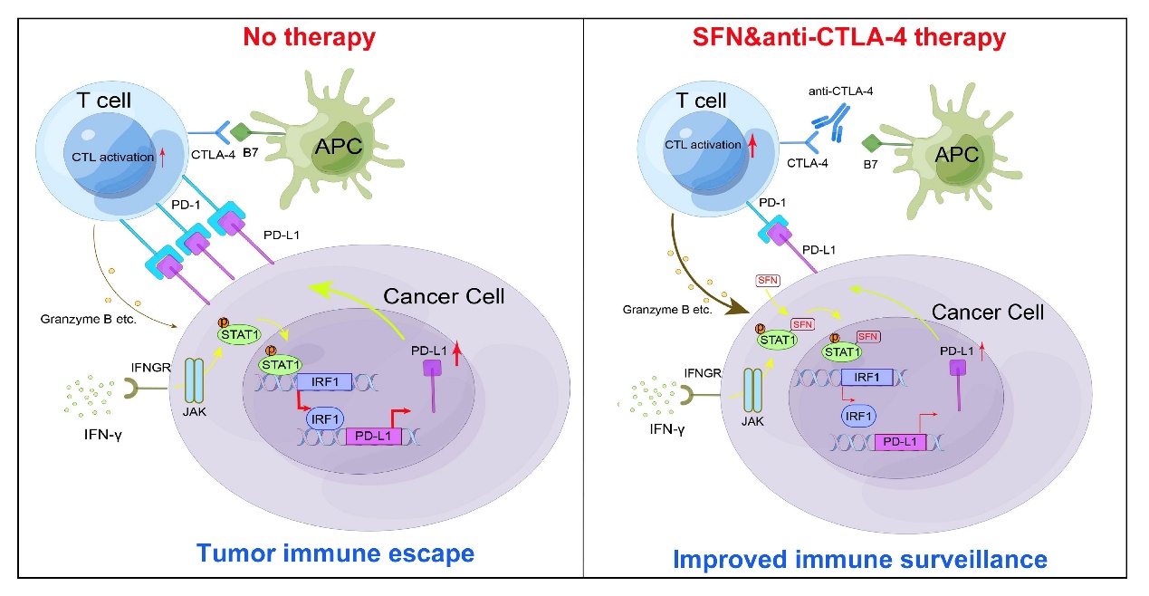PD-L1是肿瘤细胞中关键的免疫检查点受体,其表达受IFN-γ调控。研究发现,SFN能够有效阻断IFN-γ诱导的PD-L1表达。在多种人类和鼠类癌细胞系中,SFN处理显著降低了PD-L1的mRNA和蛋白水平。此外,SFN还抑制了IFN-γ诱导的IRF1表达,表明SFN通过调控STAT1-IRF1信号轴抑制PD-L1的表达。进一步的研究发现,SFN通过共价修饰STAT1蛋白的半胱氨酸残基(C155和C174)抑制其活性。LC-MS/MS分析证实了SFN对STAT1的共价修饰,并且这种修饰显著降低了STAT1的转录活性。STAT1的C155和C174位点突变后,SFN对PD-L1和IRF1表达的抑制作用显著减弱,表明这两个半胱氨酸残基在SFN介导的PD-L1抑制中起关键作用。研究还探讨了SFN与CTLA-4阻断剂的联合治疗效果。结果显示,SFN与抗CTLA-4抗体的联合治疗显著抑制了移植瘤的生长,增加了肿瘤组织中的CD8+ CTL数量和颗粒酶B的释放。这表明SFN可以通过抑制PD-L1表达,协同增强CTLA-4阻断剂的抗肿瘤免疫效果。